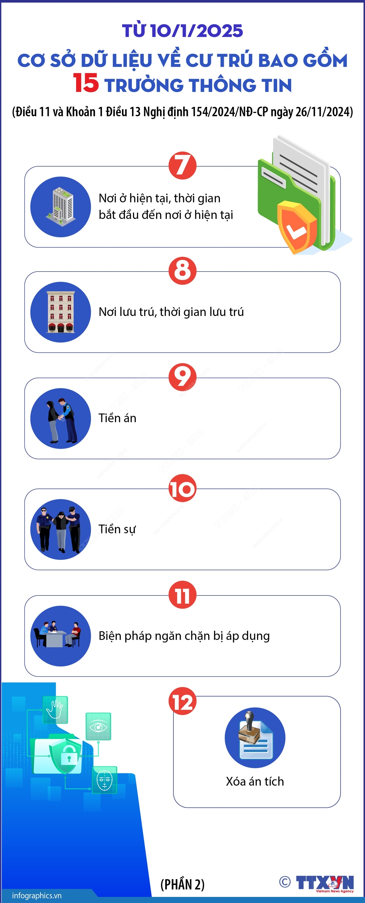 Phổ biến giáo dục Pháp luậtThông tin đồ họa Từ 10/1/2025: Cơ sở dữ liệu về cư trú bao gồm 15 trường thông tin (phần 2) Thứ tư, 15/01/2025 15:11 Theo quy định mới nhất tại Điều 11 và Khoản 1 Điều 13 Nghị định 154/2024/NĐ-CP ngày 26/11/2024 quy định chi tiết một số điều và biện pháp thi hành Luật Cư trú, từ 10/1/2025, Cơ sở dữ liệu về cư trú của công dân gồm 15 trường thông tin: Số hồ sơ cư trú; Thông tin quy định tại khoản 1 đến khoản 15, khoản 21 đến khoản 25 Điều 9 và khoản 4 Điều 15 Luật Căn cước; Tên gọi khác; Nơi thường trú, thời gian bắt đầu đến thường trú, lý do, thời điểm xóa đăng ký thường trú; Nơi tạm trú, thời gian bắt đầu đến tạm trú, thời gian tạm trú, lý do, thời điểm xóa đăng ký tạm trú… Thông tin trong Cơ sở dữ liệu về cư trú được thu thập, cập nhật, điều chỉnh từ các nguồn sau đây: Thông tin được chia sẻ, đồng bộ từ Cơ sở dữ liệu quốc gia về dân cư, Cơ sở dữ liệu căn cước và cơ sở dữ liệu quốc gia, cơ sở dữ liệu chuyên ngành khác; Từ tàng thư do lực lượng Công an nhân dân quản lý; hồ sơ đăng ký, quản lý cư trú; kết quả giải quyết thủ tục hành chính, dịch vụ công; Thông tin được số hóa, cung cấp bởi tổ chức, cá nhân và Thông tin từ các nguồn khác theo quy định pháp luật.