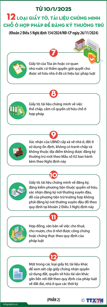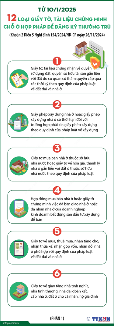 Tin cùng chuyên mục 8 nhiệm vụ, giải pháp giúp đột phá phát triển khoa học, công nghệ, đổi mới sáng tạo và chuyển đổi số quốc gia15/01/2025 15:17Phát biểu tại Hội nghị toàn quốc về đột phá phát triển khoa học, công nghệ, đổi mới sáng tạo và chuyển đổi số quốc gia tại Hà Nội, ngày 13/1/2025, Tổng Bí thư Tô Lâm đề nghị và nhấn mạnh 8 nhiệm vụ, giải pháp, nhất là những nhiệm vụ đột... Các trường hợp đăng ký cư trú phải lấy ý kiến của chủ sở hữu chỗ ở từ 10/1/202515/01/2025 15:16Khoản 1, 2, 3, 4, 5 Điều 8 Nghị định 154/2024/NĐ-CP ngày 26/11/2024 quy định chi tiết một số điều và biện pháp thi hành Luật Cư trú, từ 10/1/2025, các trường hợp đăng ký cư trú phải xin ý kiến của chủ sở hữu: Trường hợp công dân đăng ký thường trú vào... Chương trình hành động của Chính phủ thực hiện đột phá phát triển khoa học, công nghệ, chuyển đổi số15/01/2025 15:16Để được mục tiêu Nghị quyết số 57-NQ/TW đề ra, Chính phủ yêu cầu trong thời gian tới, bên cạnh các nhiệm vụ thường xuyên, các Bộ, cơ quan ngang Bộ, cơ quan thuộc Chính phủ, UBND các tỉnh, thành phố trực thuộc Trung ương cần cụ thể hóa và tổ chức triển khai thực hiện... Từ 10/1/2025: Phải đăng ký thường trú cho trẻ trong 60 ngày kể từ khi đăng ký khai sinh15/01/2025 15:15Theo Điều 7 Nghị định 154/2024/NĐ-CP ngày 26/11/2024 quy định chi tiết một số điều và biện pháp thi hành Luật Cư trú, từ 10/1/2025, trong thời hạn tối đa 60 ngày, kể từ ngày người chưa thành niên được đăng ký khai sinh thì cha hoặc mẹ hoặc chủ hộ hoặc người giám... 12 loại giấy tờ, tài liệu chứng minh chỗ ở hợp pháp để đăng ký thường trú từ 10/1/2025 (phần 1)15/01/2025 15:14Khoản 2 Điều 5 Nghị định 154/2024/NĐ-CP ngày 26/11/2024 quy định chi tiết một số điều và biện pháp thi hành Luật Cư trú, từ 10/1/2025, giấy tờ, tài liệu chứng minh chỗ ở hợp pháp để đăng ký thường trú là một trong các giấy tờ, tài liệu sau: Giấy tờ, tài... 12 loại giấy tờ, tài liệu chứng minh chỗ ở hợp pháp để đăng ký thường trú từ 10/1/2025 (phần 2)15/01/2025 15:13Khoản 2 Điều 5 Nghị định 154/2024/NĐ-CP ngày 26/11/2024 quy định chi tiết một số điều và biện pháp thi hành Luật Cư trú, từ 10/1/2025, giấy tờ, tài liệu chứng minh chỗ ở hợp pháp để đăng ký thường trú là một trong các giấy tờ, tài liệu sau: Giấy tờ, tài...