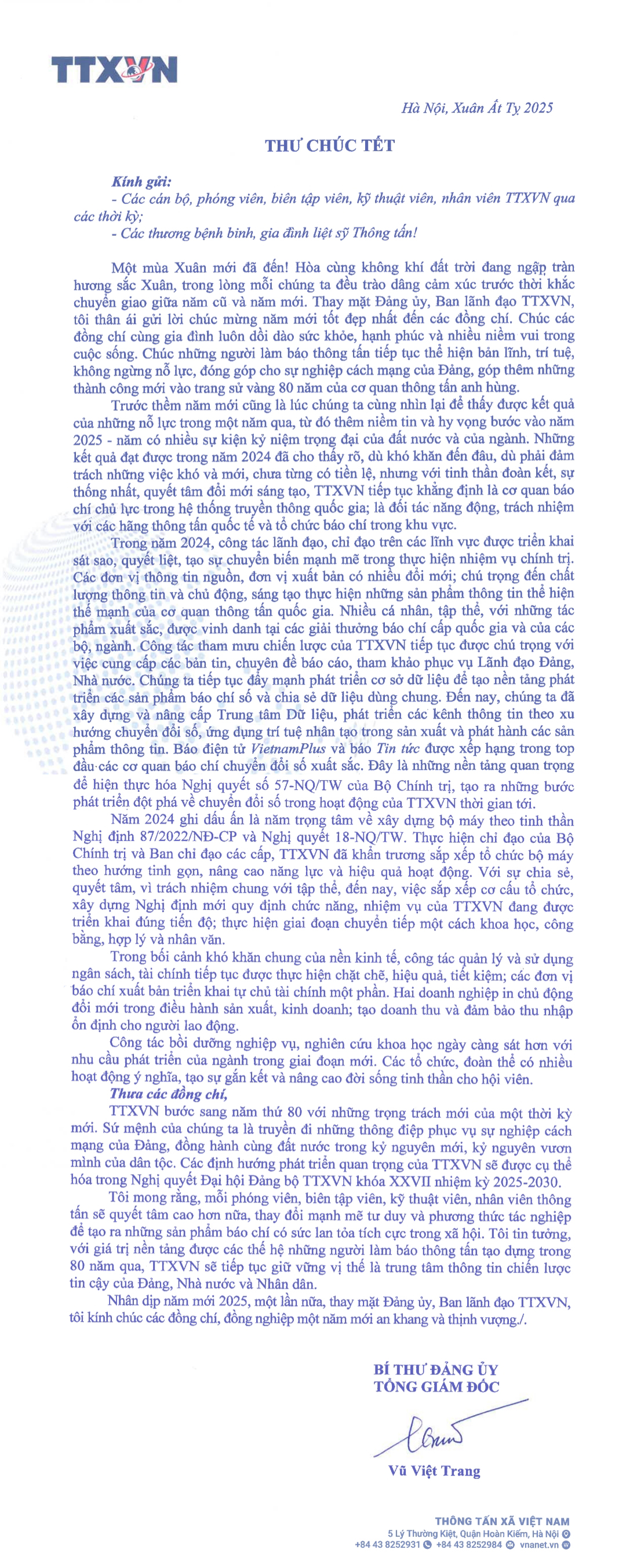 Sự kiện và kỷ niệmTin trong ngành Thư chúc Tết Ất Tỵ 2025 của Tổng giám đốc Thông tấn xã Việt Nam Thứ hai, 27/01/2025 08:39 Nhân dịp Tết nguyên đán Ất Tỵ 2025, Tổng giám đốc Thông tấn xã Việt Nam (TTXVN) Vũ Việt Trang đã gửi thư chúc Tết đến toàn thể cán bộ, phóng viên, biên tập viên, kỹ thuật viên, công nhân viên TTXVN đang công tác và đã nghỉ hưu, các đồng chí thương bệnh binh, gia đình liệt sĩ Thông tấn. TTXVN/Nội san Thông tấn
