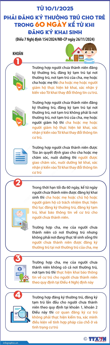 Tin cùng chuyên mục Trung ương thống nhất tinh gọn bộ máy của Chính phủ còn 17 bộ, cơ quan ngang bộ và 5 cơ quan thuộc Chính phủ02/02/2025 09:06Theo phương án sắp xếp, tinh gọn bộ máy đã được Trung ương xem xét, thống nhất tại Hội nghị Ban Chấp hành Trung ương Đảng khóa XIII diễn ra trong hai ngày 23 và 24/1/2025, tổ chức bộ máy Chính phủ nhiệm kỳ 2021-2026 sẽ được tinh gọn còn 14 bộ, 3 cơ quan ngang bộ (giảm 5... Đối tượng áp dụng Quy định chế độ, chính sách đối với các trường hợp không tái cử, tái bổ nhiệm và cán bộ thôi việc, nghỉ hưu theo nguyện vọng từ 1/1/202515/01/2025 15:18Điều 2 Nghị định số 177/2024/NĐ-CP ngày 31/12/2024 của Chính phủ có hiệu lực thi hành từ 1/1/2025 quy định cụ thể đối tượng áp dụng Quy định chế độ, chính sách đối với các trường hợp không tái cử, tái bổ nhiệm và cán bộ thôi việc, nghỉ hưu theo nguyện... 8 nhiệm vụ, giải pháp giúp đột phá phát triển khoa học, công nghệ, đổi mới sáng tạo và chuyển đổi số quốc gia15/01/2025 15:17Phát biểu tại Hội nghị toàn quốc về đột phá phát triển khoa học, công nghệ, đổi mới sáng tạo và chuyển đổi số quốc gia tại Hà Nội, ngày 13/1/2025, Tổng Bí thư Tô Lâm đề nghị và nhấn mạnh 8 nhiệm vụ, giải pháp, nhất là những nhiệm vụ đột... Các trường hợp đăng ký cư trú phải lấy ý kiến của chủ sở hữu chỗ ở từ 10/1/202515/01/2025 15:16Khoản 1, 2, 3, 4, 5 Điều 8 Nghị định 154/2024/NĐ-CP ngày 26/11/2024 quy định chi tiết một số điều và biện pháp thi hành Luật Cư trú, từ 10/1/2025, các trường hợp đăng ký cư trú phải xin ý kiến của chủ sở hữu: Trường hợp công dân đăng ký thường trú vào... Chương trình hành động của Chính phủ thực hiện đột phá phát triển khoa học, công nghệ, chuyển đổi số15/01/2025 15:16Để được mục tiêu Nghị quyết số 57-NQ/TW đề ra, Chính phủ yêu cầu trong thời gian tới, bên cạnh các nhiệm vụ thường xuyên, các Bộ, cơ quan ngang Bộ, cơ quan thuộc Chính phủ, UBND các tỉnh, thành phố trực thuộc Trung ương cần cụ thể hóa và tổ chức triển khai thực hiện... Từ 10/1/2025: Phải đăng ký thường trú cho trẻ trong 60 ngày kể từ khi đăng ký khai sinh15/01/2025 15:15Theo Điều 7 Nghị định 154/2024/NĐ-CP ngày 26/11/2024 quy định chi tiết một số điều và biện pháp thi hành Luật Cư trú, từ 10/1/2025, trong thời hạn tối đa 60 ngày, kể từ ngày người chưa thành niên được đăng ký khai sinh thì cha hoặc mẹ hoặc chủ hộ hoặc người giám...
