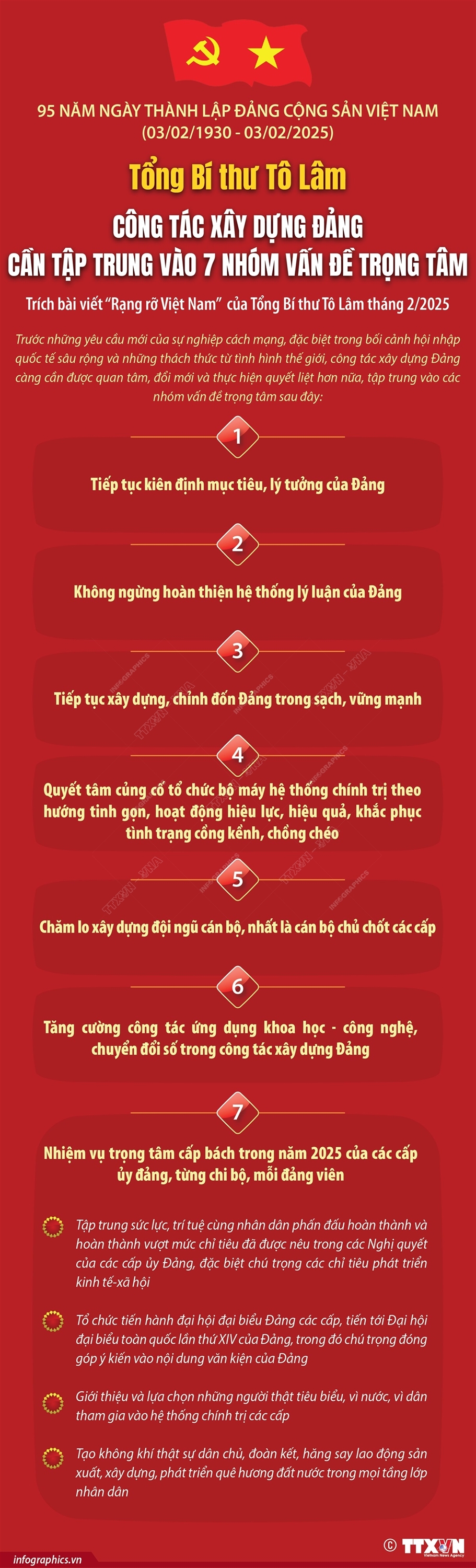 Phổ biến giáo dục Pháp luậtThông tin đồ họa Tổng Bí thư Tô Lâm: Công tác xây dựng Đảng cần tập trung vào 7 nhóm vấn đề trọng tâm Thứ ba, 04/02/2025 14:19 Nhân kỷ niệm 95 năm Ngày thành lập Đảng Cộng sản Việt Nam (03/02/1930 - 03/02/2025), Tổng Bí thư Tô Lâm đã có bài viết với tiêu đề "RẠNG RỠ VIỆT NAM". Trong bài viết, Tổng Bí thư khẳng định: Trước những yêu cầu mới của sự nghiệp cách mạng, đặc biệt trong bối cảnh hội nhập quốc tế sâu rộng và những thách thức từ tình hình thế giới, công tác xây dựng Đảng càng cần được quan tâm, đổi mới và thực hiện quyết liệt hơn nữa, tập trung vào các nhóm vấn đề trọng tâm: Tiếp tục kiên định mục tiêu, lý tưởng của Đảng, Không ngừng hoàn thiện hệ thống lý luận của Đảng, Tiếp tục xây dựng, chỉnh đốn Đảng trong sạch, vững mạnh…