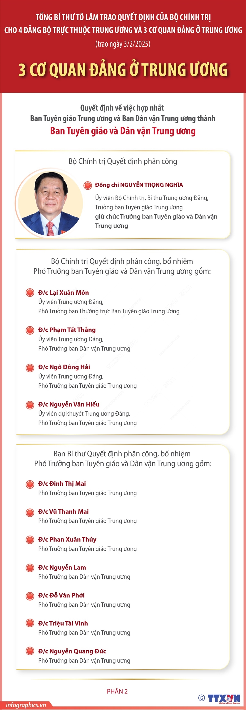 Ngày 3/2/2025, tại Trụ sở Trung ương Đảng, Thường trực Ban Bí thư đã tổ chức Hội nghị công bố Quyết định của Bộ Chính trị về việc thành lập, chỉ định nhân sự của 4 Đảng bộ trực thuộc Trung ương (Đảng bộ các cơ quan Đảng ở Trung ương, Đảng bộ Chính phủ, Đảng bộ Quốc hội và Đảng bộ Mặt trận Tổ quốc, các đoàn thể Trung ương). Bộ Chính trị chỉ định đồng chí Trần Cẩm Tú, Ủy viên Bộ Chính trị, Thường trực Ban Bí thư giữ chức Bí thư Đảng ủy các cơ quan đảng Trung ương nhiệm kỳ 2020-2025; đồng chí Phạm Minh Chính, Ủy viên Bộ Chính trị, Thủ tướng Chính phủ giữ chức Bí thư Đảng ủy Chính phủ nhiệm kỳ 2020-2025; đồng chí Trần Thanh Mẫn, Ủy viên Bộ Chính trị, Chủ tịch Quốc hội giữ chức Bí thư Đảng ủy Quốc hội nhiệm kỳ 2020-2025; đồng chí Đỗ Văn Chiến, Ủy viên Bộ Chính trị, Bí thư Trung ương Đảng, Chủ tịch Ủy ban Trung ương Mặt trận Tổ quốc Việt Nam giữ chức Bí thư Đảng ủy Mặt trận Tổ quốc, các đoàn thể Trung ương nhiệm kỳ 2020-2025. Hội nghị cũng công bố Quyết định của Bộ Chính trị về chức năng, nhiệm vụ, quyền hạn, tổ chức bộ máy, mối quan hệ công tác của 3 cơ quan Đảng ở Trung ương (Văn phòng Trung ương Đảng, Ban Tuyên giáo và Dân vận Trung ương, Ban Chính sách, chiến lược Trung ương). Bộ Chính trị quyết định đồng chí Lê Hoài Trung, Bí thư Trung ương Đảng, Trưởng ban Đối ngoại Trung ương thôi giữ chức Trưởng ban Đối ngoại Trung ương, điều động, bổ nhiệm giữ chức Chánh Văn phòng Trung ương Đảng; Quyết định phân công đồng chí Nguyễn Trọng Nghĩa, Ủy viên Bộ Chính trị, Bí thư Trung ương Đảng, Trưởng ban Tuyên giáo Trung ương giữ chức Trưởng ban Tuyên giáo và Dân vận Trung ương và đồng chí Trần Lưu Quang, Bí thư Trung ương Đảng, Trưởng Ban Kinh tế Trung ương, giữ chức Trưởng ban Chính sách, chiến lược Trung ương.