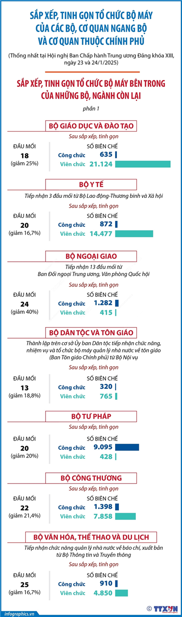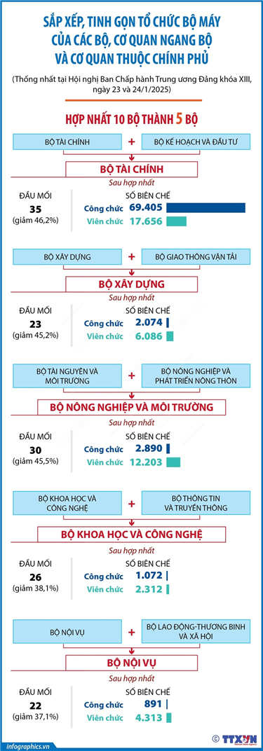 Tin cùng chuyên mục Thủ tướng đôn đốc thực hiện nhiệm vụ trọng tâm sau kỳ nghỉ Tết nguyên đán Ất Tỵ 2025 (Phần 2 và hết)06/02/2025 14:59Thủ tướng Chính phủ Phạm Minh Chính vừa ký Chỉ thị số 03/CT-TTg ngày 4/2/2025 đôn đốc thực hiện nhiệm vụ trọng tâm sau kỳ nghỉ Tết nguyên đán Ất Tỵ 2025. Thủ tướng Chính phủ yêu cầu các bộ, cơ quan, địa phương, tổ chức, cá nhân liên quan theo chức năng,... Sắp xếp, tinh gọn tổ chức bộ máy bên trong của những bộ, ngành còn lại (phần 2)06/02/2025 14:55Ban Chấp hành Trung ương Đảng đã thông qua phương án sắp xếp, tinh gọn tổ chức bộ máy của hệ thống chính trị. Theo đó, đối với các cơ quan của Chính phủ, hợp nhất 10 bộ thành 5 bộ. Trong đó, hợp nhất Bộ Kế hoạch và Đầu tư và Bộ Tài chính... Thủ tướng đôn đốc thực hiện nhiệm vụ trọng tâm sau kỳ nghỉ Tết nguyên đán Ất Tỵ 2025 (Phần 1)06/02/2025 14:51Thủ tướng Chính phủ Phạm Minh Chính vừa ký Chỉ thị số 03/CT-TTg ngày 4/2/2025 đôn đốc thực hiện nhiệm vụ trọng tâm sau kỳ nghỉ Tết nguyên đán Ất Tỵ 2025. Thủ tướng Chính phủ yêu cầu các bộ, cơ quan, địa phương, tổ chức, cá nhân liên quan theo chức năng,... Sắp xếp, tinh gọn tổ chức bộ máy bên trong của 3 cơ quan ngang bộ và 5 cơ quan thuộc Chính phủ06/02/2025 14:50Ban Chấp hành Trung ương Đảng đã thông qua phương án sắp xếp, tinh gọn tổ chức bộ máy của hệ thống chính trị. Theo đó, đối với các cơ quan của Chính phủ, hợp nhất 10 bộ thành 5 bộ. Trong đó, hợp nhất Bộ Kế hoạch và Đầu tư và Bộ Tài chính... Sắp xếp, tinh gọn tổ chức bộ máy bên trong của những bộ, ngành còn lại (phần 1)06/02/2025 14:49Ban Chấp hành Trung ương Đảng đã thông qua phương án sắp xếp, tinh gọn tổ chức bộ máy của hệ thống chính trị. Theo đó, đối với các cơ quan của Chính phủ, hợp nhất 10 bộ thành 5 bộ. Trong đó, hợp nhất Bộ Kế hoạch và Đầu tư và Bộ Tài chính... Sắp xếp, tinh gọn tổ chức bộ máy của các bộ, cơ quan ngang bộ và cơ quan thuộc Chính phủ: Hợp nhất 10 bộ thành 5 bộ06/02/2025 14:48Ban Chấp hành Trung ương Đảng đã thông qua phương án sắp xếp, tinh gọn tổ chức bộ máy của hệ thống chính trị. Theo đó, đối với các cơ quan của Chính phủ, hợp nhất 10 bộ thành 5 bộ. Trong đó, hợp nhất Bộ Kế hoạch và Đầu tư và Bộ Tài chính...