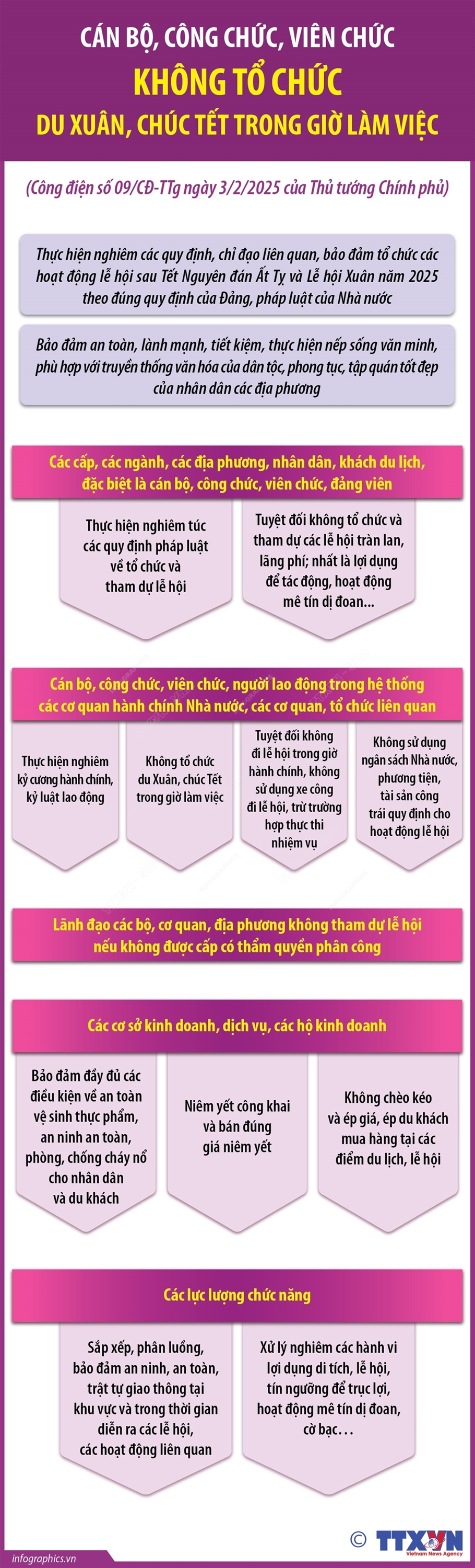 Phổ biến giáo dục Pháp luậtThông tin đồ họa Cán bộ, công chức, viên chức không tổ chức du Xuân, chúc Tết trong giờ làm việc Thứ năm, 06/02/2025 15:00 Thủ tướng Chính phủ Phạm Minh Chính ký Công điện số 09/CĐ-TTg ngày 3/2/2025 yêu cầu các Bộ ngành, địa phương bảo đảm thực hiện nếp sống văn minh, an toàn, tiết kiệm trong các hoạt động lễ hội sau Tết Nguyên đán Ất Tỵ và Lễ hội Xuân năm 2025. Công điện nêu: Trong dịp Tết, sau Tết Nguyên đán Ất Tỵ và Lễ hội xuân năm 2025 đã và đang diễn ra nhiều hoạt động lễ hội thu hút đông đảo Nhân dân tham dự ở các địa phương trên cả nước. Để tiếp tục thực hiện nghiêm các quy định, chỉ đạo liên quan, bảo đảm tổ chức các hoạt động lễ hội sau Tết Nguyên đán Ất Tỵ và Lễ hội xuân năm 2025 theo đúng quy định của Đảng, pháp luật của Nhà nước, bảo đảm an toàn, lành mạnh, tiết kiệm, thực hiện nếp sống văn minh, phù hợp với truyền thống văn hóa của dân tộc và phong tục, tập quán tốt đẹp của Nhân dân các địa phương, Thủ tướng Chính phủ yêu cầu cán bộ, công chức, viên chức, người lao động tuyệt đối không đi lễ hội Xuân trong giờ hành chính, không sử dụng xe công đi lễ hội trừ trường hợp thực thi nhiệm vụ...