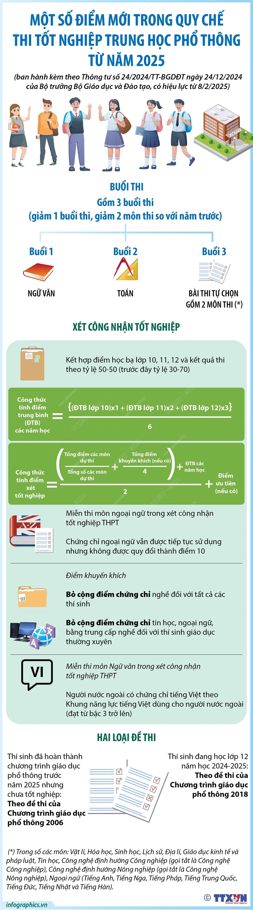 Phổ biến giáo dục Pháp luậtThông tin đồ họa Một số điểm mới trong Quy chế thi tốt nghiệp Trung học Phổ thông từ năm 2025 Thứ ba, 11/02/2025 14:17 Từ 8/2/2025, Thông tư số 24/2024/TT-BGDĐT ban hành Quy chế thi tốt nghiệp Trung học Phổ thông của Bộ Giáo dục và Đào tạo có hiệu lực thi hành. Quy chế thi tốt nghiệp THPT ban hành kèm theo Thông tư 24/2024/TT-BGDĐT có một số điểm mới đáng chú ý như: Chỉ còn 3 buổi thi tốt nghiệp, giảm 1 buổi thi và 2 môn thi so với năm 2024; chứng chỉ ngoại ngữ vẫn được sử dụng để xét công nhận tốt nghiệp THPT nhưng không được quy đổi thành điểm 10; thí sinh không còn được cộng điểm chứng chỉ nghề; thí sinh người nước ngoài miễn thi ngữ văn bằng chứng chỉ tiếng Việt…
