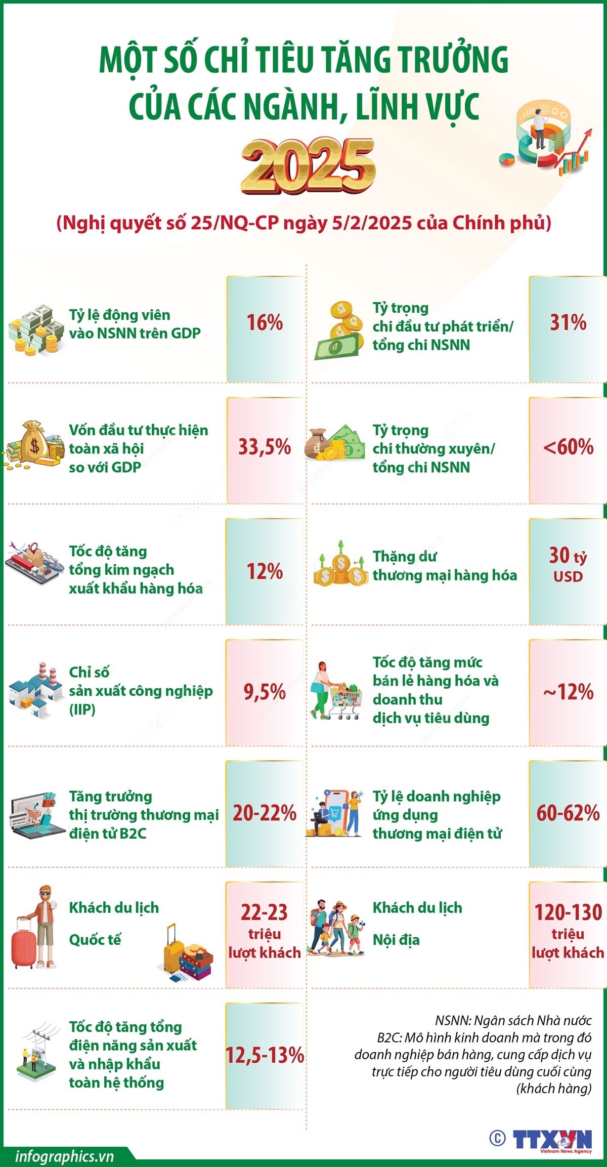 Phổ biến giáo dục Pháp luậtThông tin đồ họa Một số chỉ tiêu tăng trưởng của các ngành, lĩnh vực năm 2025 Thứ ba, 11/02/2025 14:18 Tại Nghị quyết số 25/NQ-CP ngày 5/2/2025 về mục tiêu tăng trưởng các ngành, lĩnh vực và địa phương bảo đảm mục tiêu tăng trưởng cả nước năm 2025 đạt 8% trở lên, Chính phủ đã giao một số chỉ tiêu tăng trưởng cho các ngành, các lĩnh vực như: tổng kim ngạch xuất nhập khẩu hàng hóa tăng 12%, bán lẻ hàng hóa và doanh thu dịch vụ tiêu dùng tăng 12%, khách du lịch quốc tế đạt 22-23 triệu lượt khách, nội địa đạt 120-130 triệu lượt khách…