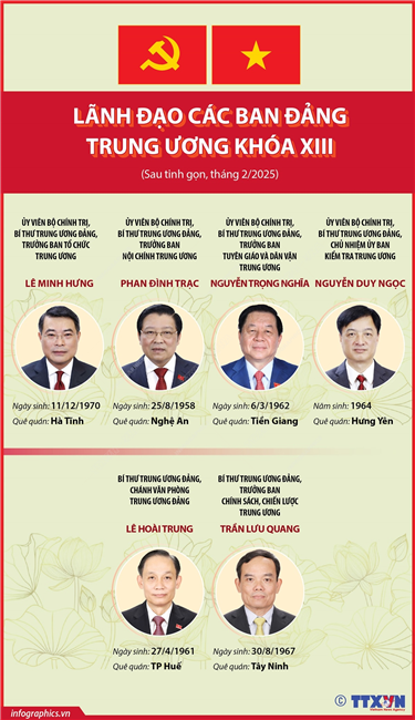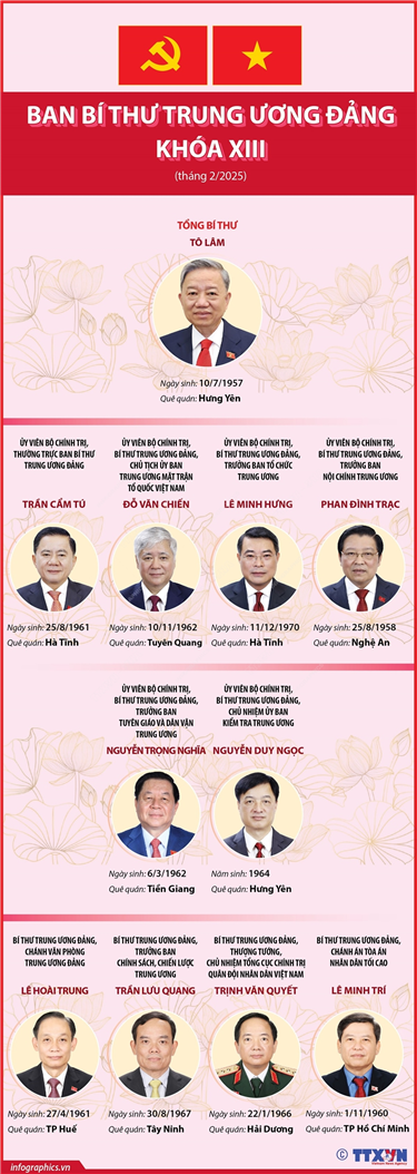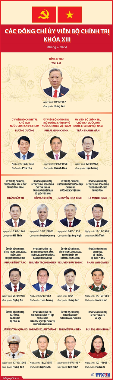 Tin cùng chuyên mục Dự kiến những nội dung chính tại Kỳ họp bất thường lần thứ 9, Quốc hội khóa XV13/02/2025 14:21Kỳ họp bất thường lần thứ 9, Quốc hội khóa XV khai mạc vào ngày 12/2/2025 và dự kiến bế mạc vào ngày 19/2/2025 theo hình thức họp tập trung tại Nhà Quốc hội, Thủ đô Hà Nội. Tại Kỳ họp này, Quốc hội sẽ xem xét, thông qua: Luật sửa đổi, bổ sung một số điều của... Một số chỉ tiêu tăng trưởng của các ngành, lĩnh vực năm 202511/02/2025 14:18Tại Nghị quyết số 25/NQ-CP ngày 5/2/2025 về mục tiêu tăng trưởng các ngành, lĩnh vực và địa phương bảo đảm mục tiêu tăng trưởng cả nước năm 2025 đạt 8% trở lên, Chính phủ đã giao một số chỉ tiêu tăng trưởng cho các ngành, các lĩnh vực như: tổng kim ngạch xuất... Một số điểm mới trong Quy chế thi tốt nghiệp Trung học Phổ thông từ năm 202511/02/2025 14:17Từ 8/2/2025, Thông tư số 24/2024/TT-BGDĐT ban hành Quy chế thi tốt nghiệp Trung học Phổ thông của Bộ Giáo dục và Đào tạo có hiệu lực thi hành. Quy chế thi tốt nghiệp THPT ban hành kèm theo Thông tư 24/2024/TT-BGDĐT có một số điểm mới đáng chú ý... Các đồng chí Ủy viên Bộ Chính trị khóa XIII (tháng 2/2025)07/02/2025 14:22Bộ Chính trị khóa XIII hiện có 16 đồng chí: Tổng Bí thư Tô Lâm; Ủy viên Bộ Chính trị, Chủ tịch nước Lương Cường; Ủy viên Bộ Chính trị, Thủ tướng Chính phủ Phạm Minh Chính; Ủy viên Bộ Chính trị, Chủ tịch Quốc hội Trần Thanh Mẫn; Ủy viên Bộ... Ban Bí thư Trung ương Đảng khóa XIII (tháng 2/2025)07/02/2025 14:21Ban Bí thư Trung ương Đảng khóa XIII hiện có 11 đồng chí: Tổng Bí thư Tô Lâm; Ủy viên Bộ Chính trị, Thường trực Ban Bí thư Trần Cẩm Tú; Ủy viên Bộ Chính trị, Bí thư Trung ương Đảng, Chủ tịch Ủy ban Trung ương MTTQ Việt Nam Đỗ Văn Chiến; Ủy viên Bộ... Lãnh đạo các Ban Đảng Trung ương khóa XIII (sau tinh gọn, tháng 2/2025)07/02/2025 14:20Sau sắp xếp, tinh gọn, Trung ương còn 6 ban Đảng. Dưới đây là lãnh đạo các Ban Đảng ở Trung ương: Đồng chí Lê Minh Hưng, Ủy viên Bộ Chính trị, Bí thư Trung ương Đảng, Trưởng ban Tổ chức Trung ương; đồng chí Phan Đình Trạc, Ủy viên Bộ Chính trị,...