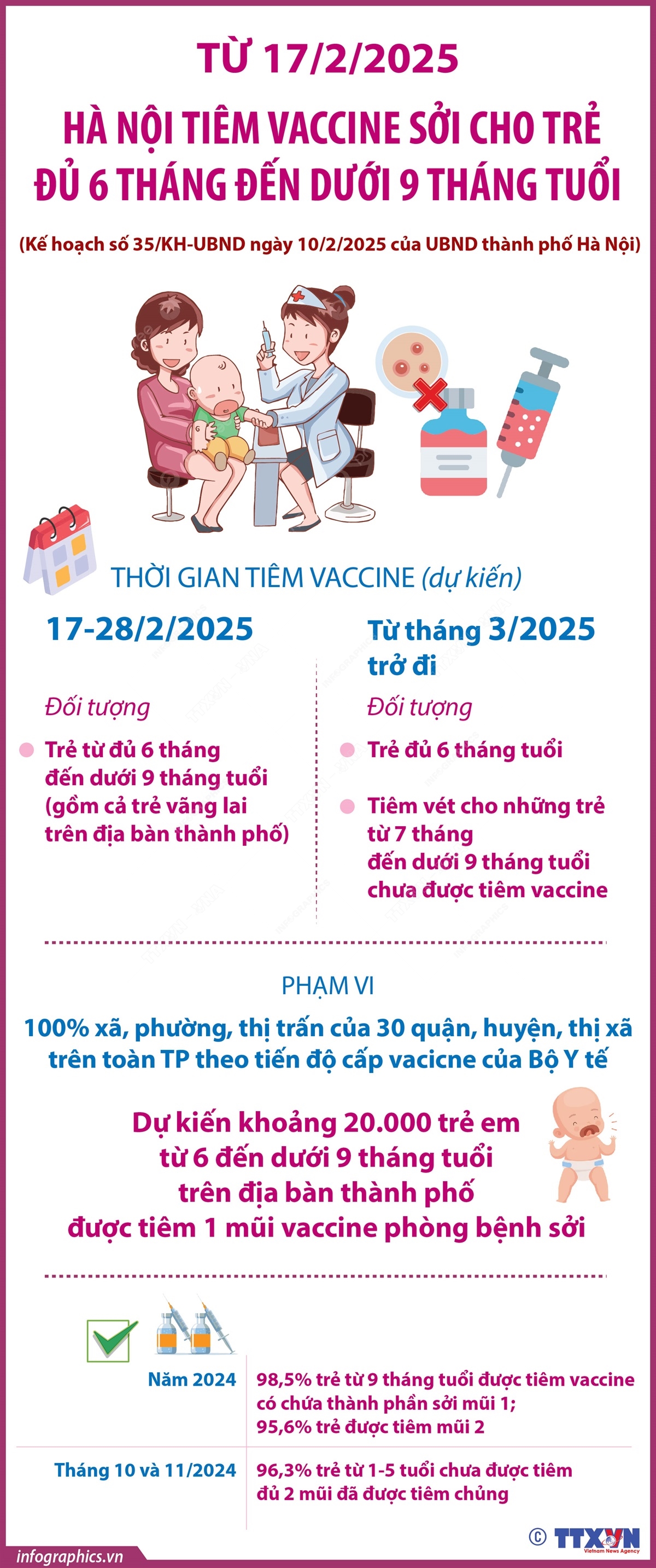 Phổ biến giáo dục Pháp luậtThông tin đồ họa Từ 17/2/2025: Tiêm vaccine sởi trẻ đủ 6 tháng đến dưới 9 tháng tuổi ở Hà Nội Thứ năm, 13/02/2025 14:24 Theo Kế hoạch số 35/KH-UBND ngày 10/2/2025 của UBND TP Hà Nội, từ 17/2/2025, Hà Nội triển khai tiêm vaccine sởi cho trẻ từ đủ 6 tháng tuổi đến dưới 9 tháng tuổi. Dự kiến có khoảng 20.000 trẻ em từ 6 đến dưới 9 tháng tuổi trên địa bàn thành phố được tiêm 1 mũi vaccine phòng bệnh sởi. Nguồn vaccine được cung ứng từ Bộ Y tế.