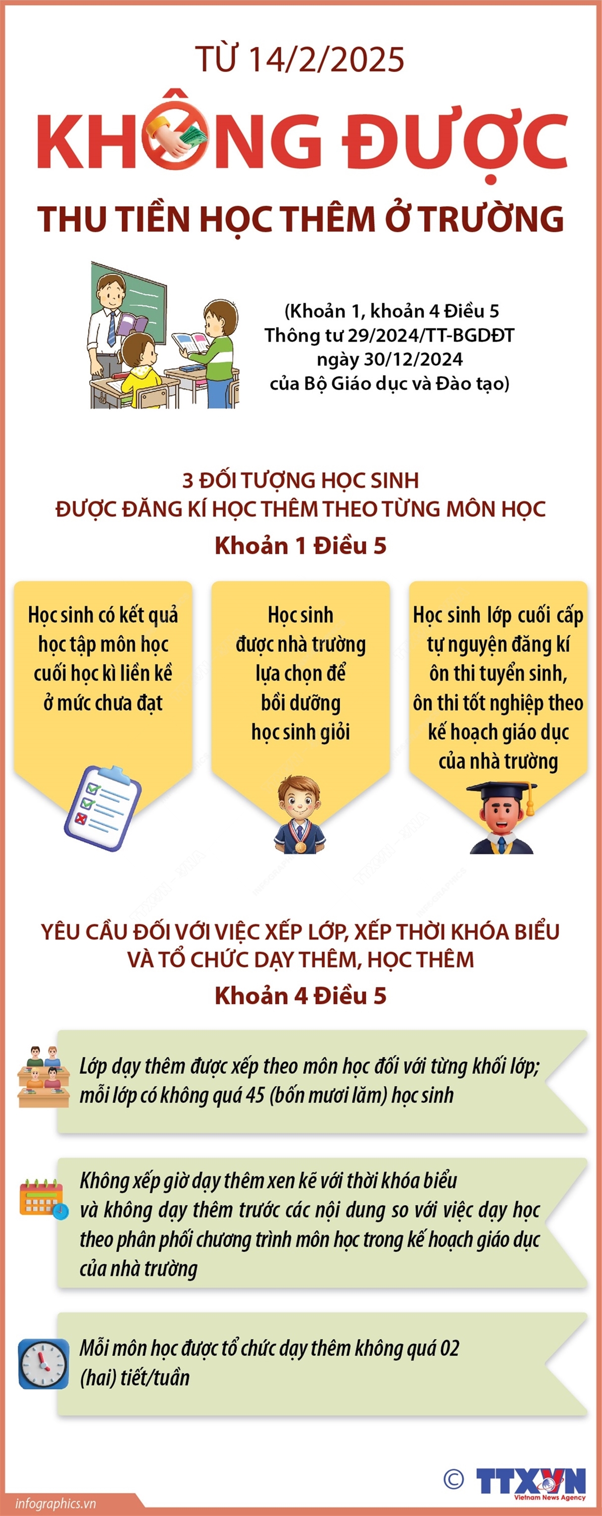 Phổ biến giáo dục Pháp luậtThông tin đồ họa Từ 14/2/2025: Không được thu tiền học thêm ở trường Thứ hai, 17/02/2025 10:20 Theo khoản 1 Điều 5 Thông tư 29/2024/TT-BGDĐT của Bộ Giáo dục và Đào tạo quy định về dạy thêm, học thêm, từ 14/2/2025, nhà trường chỉ tổ chức dạy thêm, học thêm cho: học sinh có kết quả học tập môn học cuối học kì liền kề ở mức chưa đạt; học sinh được nhà trường lựa chọn để bồi dưỡng học sinh giỏi và học sinh lớp cuối cấp tự nguyện đăng kí ôn thi tuyển sinh, ôn thi tốt nghiệp theo kế hoạch giáo dục của nhà trường. Nhà trường không được thu tiền học thêm của học sinh. Theo khoản 4 điều 5, không xếp giờ dạy thêm xen kẽ với thời khóa biểu và không dạy thêm trước các nội dung so với việc dạy học theo phân phối chương trình môn học trong kế hoạch giáo dục của nhà trường; Mỗi môn học được tổ chức dạy thêm không quá 02 (hai) tiết/tuần…