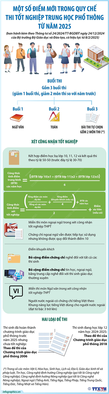 Tin cùng chuyên mục Từ 14/2/2025: Không được thu tiền học thêm ở trường17/02/2025 10:20Theo khoản 1 Điều 5 Thông tư 29/2024/TT-BGDĐT của Bộ Giáo dục và Đào tạo quy định về dạy thêm, học thêm, từ 14/2/2025, nhà trường chỉ tổ chức dạy thêm, học thêm cho: học sinh có kết quả học tập môn học cuối học kì liền kề ở mức chưa đạt; học sinh được nhà trường... 3 trường hợp không được dạy thêm, tổ chức dạy thêm từ 14/2/202517/02/2025 10:19 Theo Điều 4 Thông tư 29/2024/TT-BGDĐT của Bộ Giáo dục và Đào tạo quy định về dạy thêm, học thêm, từ 14/2/2025, có 3 trường hợp không được dạy thêm, tổ chức dạy thêm: Không tổ chức dạy thêm đối với học sinh tiểu học, trừ các trường hợp: bồi dưỡng về nghệ thuật,... Từ 17/2/2025: Tiêm vaccine sởi trẻ đủ 6 tháng đến dưới 9 tháng tuổi ở Hà Nội13/02/2025 14:24Theo Kế hoạch số 35/KH-UBND ngày 10/2/2025 của UBND TP Hà Nội, từ 17/2/2025, Hà Nội triển khai tiêm vaccine sởi cho trẻ từ đủ 6 tháng tuổi đến dưới 9 tháng tuổi. Dự kiến có khoảng 20.000 trẻ em từ 6 đến dưới 9 tháng tuổi trên địa bàn thành phố được tiêm 1 mũi... Dự kiến những nội dung chính tại Kỳ họp bất thường lần thứ 9, Quốc hội khóa XV13/02/2025 14:21Kỳ họp bất thường lần thứ 9, Quốc hội khóa XV khai mạc vào ngày 12/2/2025 và dự kiến bế mạc vào ngày 19/2/2025 theo hình thức họp tập trung tại Nhà Quốc hội, Thủ đô Hà Nội. Tại Kỳ họp này, Quốc hội sẽ xem xét, thông qua: Luật sửa đổi, bổ sung một số điều của... Một số chỉ tiêu tăng trưởng của các ngành, lĩnh vực năm 202511/02/2025 14:18Tại Nghị quyết số 25/NQ-CP ngày 5/2/2025 về mục tiêu tăng trưởng các ngành, lĩnh vực và địa phương bảo đảm mục tiêu tăng trưởng cả nước năm 2025 đạt 8% trở lên, Chính phủ đã giao một số chỉ tiêu tăng trưởng cho các ngành, các lĩnh vực như: tổng kim ngạch xuất... Một số điểm mới trong Quy chế thi tốt nghiệp Trung học Phổ thông từ năm 202511/02/2025 14:17Từ 8/2/2025, Thông tư số 24/2024/TT-BGDĐT ban hành Quy chế thi tốt nghiệp Trung học Phổ thông của Bộ Giáo dục và Đào tạo có hiệu lực thi hành. Quy chế thi tốt nghiệp THPT ban hành kèm theo Thông tư 24/2024/TT-BGDĐT có một số điểm mới đáng chú ý...
