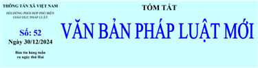 Tin cùng chuyên mục Tóm tắt Văn bản pháp luật mới: số 05 ngày 10/02/2025 của Hội đồng phối hợp Phổ biến giáo dục pháp luật TTXVN11/02/2025 14:12 Tóm tắt Văn bản pháp luật mới: số 03 ngày 20/01/2025 của Hội đồng phối hợp Phổ biến giáo dục pháp luật TTXVN04/02/2025 14:44 Tóm tắt Văn bản pháp luật mới: số 04 ngày 03/02/2025 của Hội đồng phối hợp Phổ biến giáo dục pháp luật TTXVN04/02/2025 14:39 Tóm tắt Văn bản pháp luật mới: số 02 ngày 13/01/2025 của Hội đồng phối hợp Phổ biến giáo dục pháp luật TTXVN15/01/2025 15:02 Tóm tắt Văn bản pháp luật mới: số 01 ngày 06/01/2025 của Hội đồng phối hợp Phổ biến giáo dục pháp luật TTXVN09/01/2025 16:13 Tóm tắt Văn bản pháp luật mới: số 52 ngày 30/12/2024 của Hội đồng phối hợp Phổ biến giáo dục pháp luật TTXVN31/12/2024 14:55