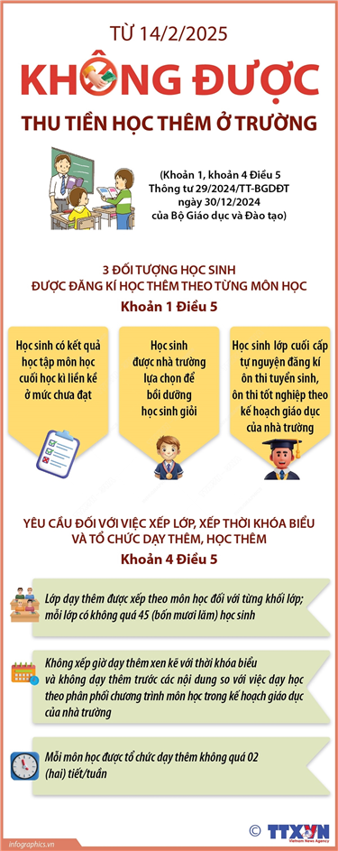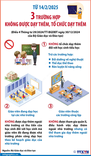 Tin cùng chuyên mục Thành viên Chính phủ nhiệm kỳ Quốc hội khóa XV (sau sắp xếp, tinh gọn)19/02/2025 10:59Ngày 18/2/2025, tại Kỳ họp bất thường lần thứ 9, Quốc hội khóa XV đã thông qua Nghị quyết số 176/2025/QH15 về cơ cấu tổ chức của Chính phủ nhiệm kỳ Quốc hội khóa XV và Nghị quyết số 177/2025/QH15 về cơ cấu số lượng thành viên Chính phủ nhiệm kỳ Quốc hội khóa XV. Quốc hội... Từ 18/2/2025: Hàng hóa nhập khẩu có giá trị từ 1 triệu đồng trở xuống gửi qua dịch vụ chuyển phát nhanh quốc tế phải nộp thuế giá trị gia tăng19/02/2025 10:57Theo Quyết định số 01/2025/QĐ-TTg ngày 3/1/2025 của Thủ tướng Chính phủ, từ 18/2/2025, hàng hóa nhập khẩu gửi qua dịch vụ chuyển phát nhanh quốc tế có trị giá hải quan trong định mức miễn thuế nhập khẩu theo quy định tại khoản 2 Điều 29 Nghị định số 134/2016/NĐ-CP (hàng hóa... Tăng số lượng Thứ trưởng, Phó Thủ trưởng cơ quan ngang Bộ17/02/2025 10:21Tại Nghị quyết số 1402/NQ-UBTVQH15, Ủy ban Thường vụ Quốc hội quyết nghị: tăng thêm 1 Thứ trưởng để tổng số Thứ trưởng Bộ Ngoại giao là không quá 7; tăng thêm 4 Thứ trưởng để tổng số Thứ trưởng Bộ Tài chính là không quá 9; tăng thêm 4 Thứ trưởng để tổng số Thứ trưởng Bộ... Từ 14/2/2025: Không được thu tiền học thêm ở trường17/02/2025 10:20Theo khoản 1 Điều 5 Thông tư 29/2024/TT-BGDĐT của Bộ Giáo dục và Đào tạo quy định về dạy thêm, học thêm, từ 14/2/2025, nhà trường chỉ tổ chức dạy thêm, học thêm cho: học sinh có kết quả học tập môn học cuối học kì liền kề ở mức chưa đạt; học sinh được nhà trường... 3 trường hợp không được dạy thêm, tổ chức dạy thêm từ 14/2/202517/02/2025 10:19 Theo Điều 4 Thông tư 29/2024/TT-BGDĐT của Bộ Giáo dục và Đào tạo quy định về dạy thêm, học thêm, từ 14/2/2025, có 3 trường hợp không được dạy thêm, tổ chức dạy thêm: Không tổ chức dạy thêm đối với học sinh tiểu học, trừ các trường hợp: bồi dưỡng về nghệ thuật,... Từ 17/2/2025: Tiêm vaccine sởi trẻ đủ 6 tháng đến dưới 9 tháng tuổi ở Hà Nội13/02/2025 14:24Theo Kế hoạch số 35/KH-UBND ngày 10/2/2025 của UBND TP Hà Nội, từ 17/2/2025, Hà Nội triển khai tiêm vaccine sởi cho trẻ từ đủ 6 tháng tuổi đến dưới 9 tháng tuổi. Dự kiến có khoảng 20.000 trẻ em từ 6 đến dưới 9 tháng tuổi trên địa bàn thành phố được tiêm 1 mũi...