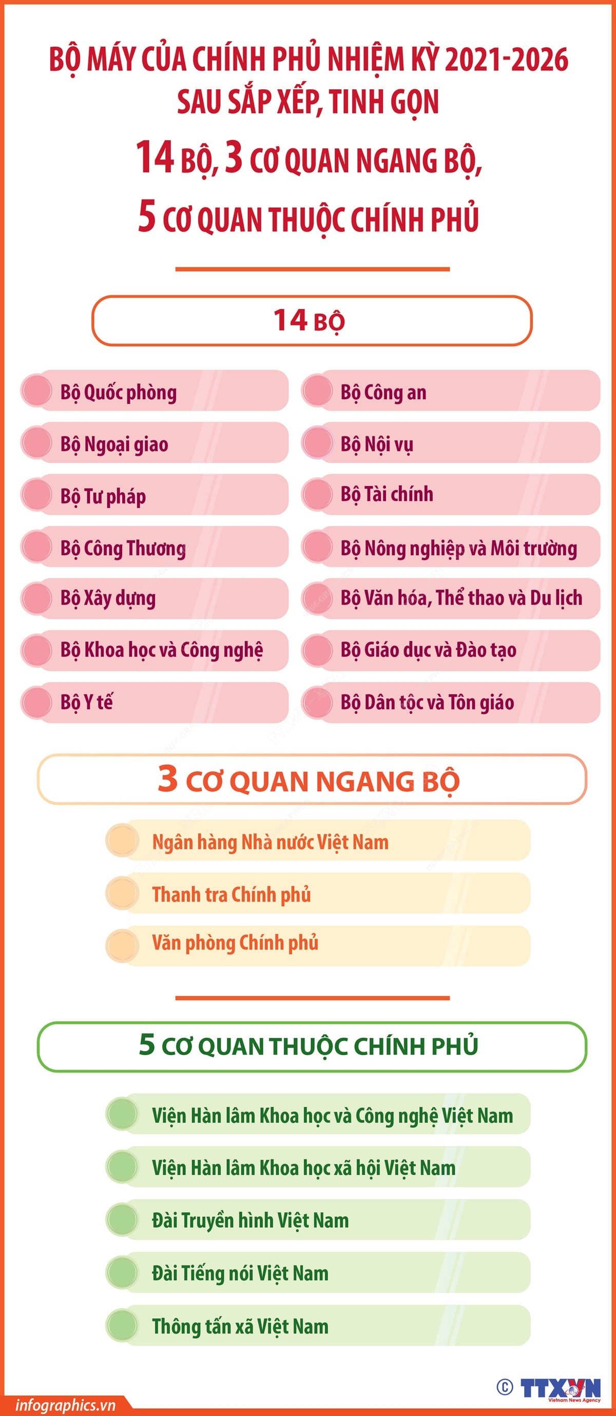 Phổ biến giáo dục Pháp luậtThông tin đồ họa Bộ máy của Chính phủ nhiệm kỳ 2021-2026 sau sắp xếp, tinh gọn Thứ tư, 19/02/2025 11:01 Sau sắp xếp, tinh gọn, Chính phủ nhiệm kỳ 2021-2026 có 14 Bộ, 3 Cơ quan ngang Bộ và 5 cơ quan thuộc Chính phủ.