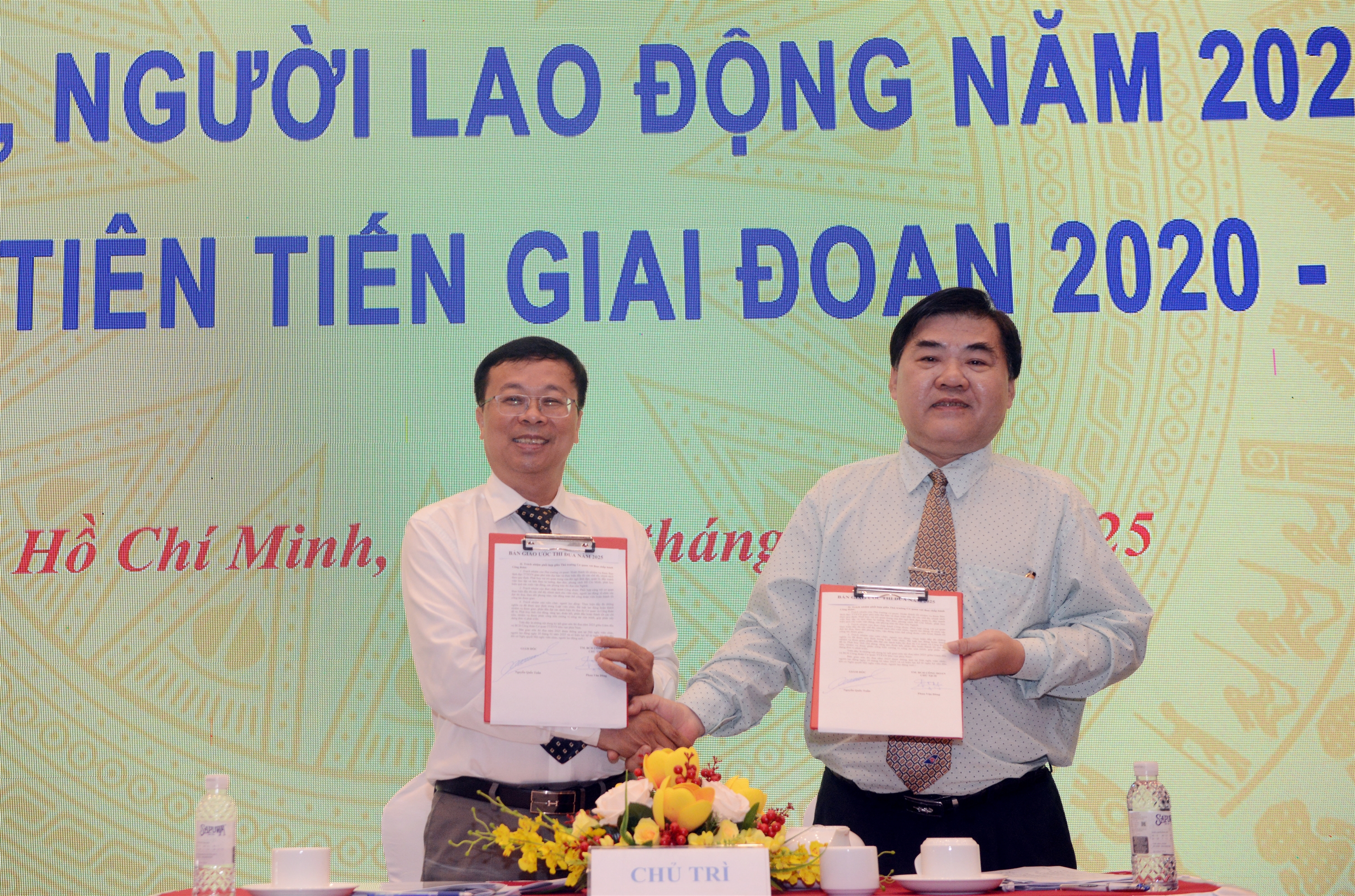 | Giám đốc Cơ quan TTXVN khu vực phía Nam Nguyễn Quốc Tuấn và Chủ tịch Công đoàn Cơ quan khu vực phía Nam Phan Văn Đông ký kết giao ước thi đua năm 2025, ngày 20/2 |