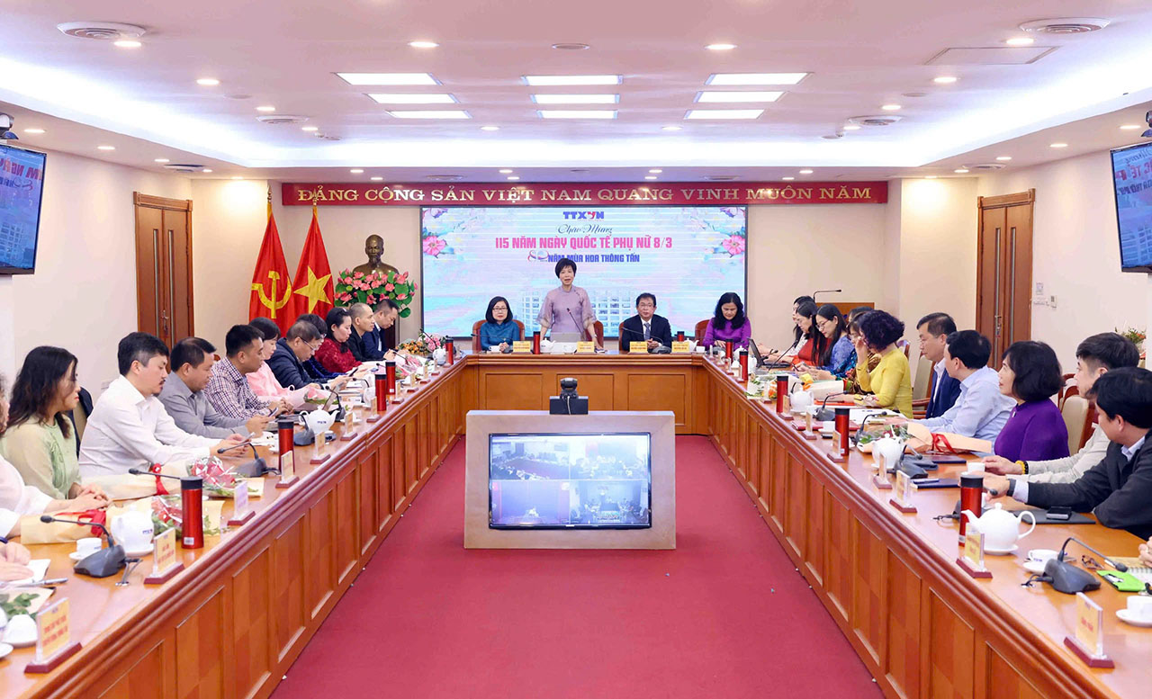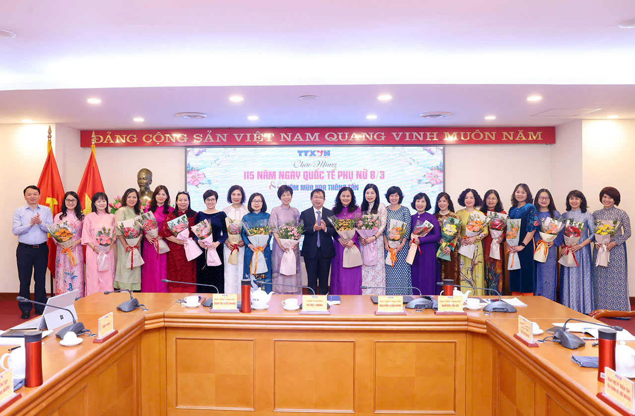 Sự kiện và kỷ niệmTin trong ngành Chúc mừng ngày Quốc tế phụ nữ 8/3 Thứ hai, 03/03/2025 15:42 Ngày 3/3, nhân kỷ niệm 115 năm ngày Quốc tế phụ nữ (8/3/1910 - 8/3/2025), tại Hội nghị giao ban toàn ngành, Đảng ủy, Ban lãnh đạo Thông tấn xã Việt Nam (TTXVN) đã tặng hoa, gửi lời chúc mừng tốt đẹp nhất tới toàn thể nữ cán bộ, phóng viên, công nhân viên các đơn vị trong ngành. Bí thư Đảng ủy, Tổng giám đốc TTXVN Vũ Việt Trang phát biểu chúc mừng nữ cán bộ, phóng viên, công nhân viên các đơn vị trong ngành nhân ngày Quốc tế phụ nữ 8/3, ngày 3/3 Hiện nay, toàn ngành có 1.006 nữ cán bộ, viên chức, người lao động trong tổng số 1.990 viên chức, chiếm 50,5%. Thời gian qua, được sự quan tâm và tạo điều kiện của Đảng ủy, Ban lãnh đạo, Công đoàn TTXVN, điều kiện làm việc và đời sống của cán bộ, phóng viên, công nhân viên trong ngành nói chung, nữ công đoàn viên nói riêng được đảm bảo, từng bước nâng cao. Chị em đã tích cực phát huy khả năng chuyên môn nghiệp vụ, cống hiến cho sự phát triển của TTXVN./. Đảng ủy, Ban lãnh đạo, Công đoàn TTXVN chúc mừng kỷ niệm 115 năm ngày Quốc tế phụ nữ 8/3, ngày 3/3 Nội san Thông tấn