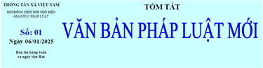 Tin cùng chuyên mục Tóm tắt Văn bản pháp luật mới: số 06 ngày 17/02/2025 của Hội đồng phối hợp Phổ biến giáo dục pháp luật TTXVN19/02/2025 10:51 Tóm tắt Văn bản pháp luật mới: số 05 ngày 10/02/2025 của Hội đồng phối hợp Phổ biến giáo dục pháp luật TTXVN11/02/2025 14:12 Tóm tắt Văn bản pháp luật mới: số 03 ngày 20/01/2025 của Hội đồng phối hợp Phổ biến giáo dục pháp luật TTXVN04/02/2025 14:44 Tóm tắt Văn bản pháp luật mới: số 04 ngày 03/02/2025 của Hội đồng phối hợp Phổ biến giáo dục pháp luật TTXVN04/02/2025 14:39 Tóm tắt Văn bản pháp luật mới: số 02 ngày 13/01/2025 của Hội đồng phối hợp Phổ biến giáo dục pháp luật TTXVN15/01/2025 15:02 Tóm tắt Văn bản pháp luật mới: số 01 ngày 06/01/2025 của Hội đồng phối hợp Phổ biến giáo dục pháp luật TTXVN09/01/2025 16:13