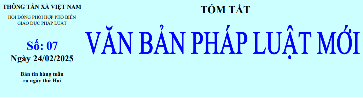 Phổ biến giáo dục Pháp luậtBản tin văn bản Pháp luật Tóm tắt Văn bản pháp luật mới: số 07 ngày 24/02/2025 của Hội đồng phối hợp Phổ biến giáo dục pháp luật TTXVN Thứ ba, 04/03/2025 11:38 Phòng Tổng hợp - Kiểm tra - Pháp chế Thường trực Hội đồng phối hợp Phổ biến, giáo dục pháp luật TTXVN