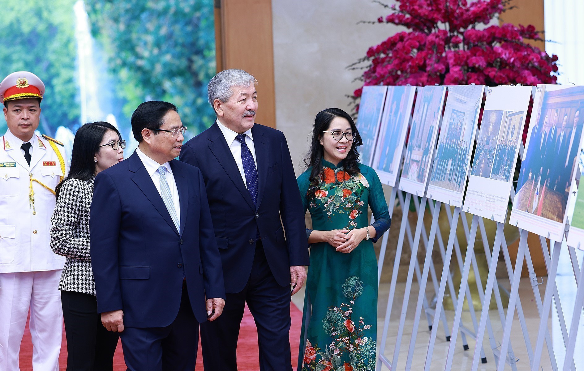 Sự kiện và kỷ niệmTin trong ngành Trưng bày ảnh Việt Nam và Kyrgyzstan Thứ năm, 06/03/2025 14:28 Nhận lời mời của Thủ tướng Chính phủ Phạm Minh Chính, Thủ tướng Kyrgyzstan Adylbek Kasimalyev đến Hà Nội, bắt đầu thăm chính thức Việt Nam từ ngày 5-7/3. Trong khuôn khổ chuyến thăm và làm việc, sáng 6/3, Thủ tướng Phạm Minh Chính và Thủ tướng Kyrgyzstan Adylbek Kasimalyev đã tham quan trưng bày ảnh về quan hệ hợp tác giữa hai nước do Thông tấn xã Việt Nam (TTXVN) thực hiện./. Phó trưởng ban Thư ký biên tập và Quan hệ đối ngoại TTXVN Nguyễn Ngọc Anh giới thiệu với Thủ tướng Phạm Minh Chính và Thủ tướng Kyrgyzstan Adylbek Kasimalyev những bức ảnh tiêu biểu về quan hệ hợp tác giữa hai nước, ngày 6/3 TTXVN/Nội san Thông tấn