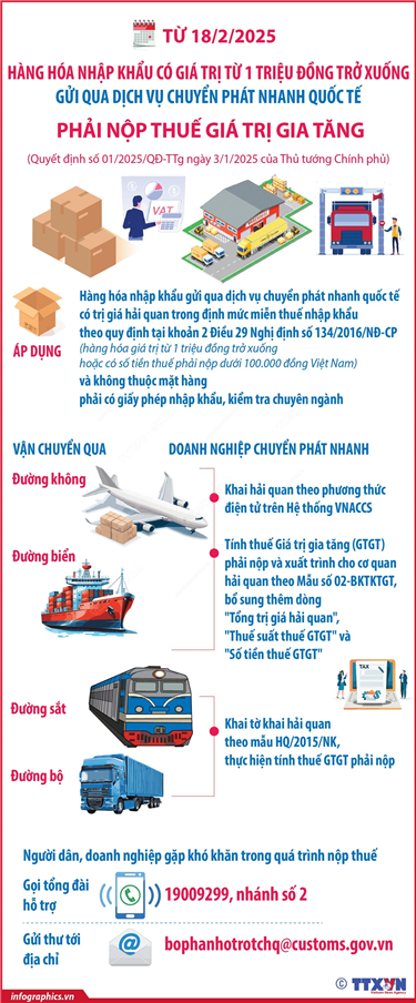 Tin cùng chuyên mục Tiếp tục miễn lệ phí trước bạ lần đầu cho ô tô điện chạy pin12/03/2025 15:06Theo Nghị định 51/2025/NĐ-CP ngày 1/3/2025 sửa đổi, bổ sung một số điều của Nghị định số 10/2022/NĐ-CP ngày 15/1/2022 của Chính phủ quy định về lệ phía trước bạ, xe ô tô điện chạy pin tiếp tục được miễn thuế trước bạ lần đầu đến ngày 28/2/2027. Các trường hợp bị tạm hoãn xuất cảnh từ 28/2/202512/03/2025 15:05Chính phủ vừa ban hành Nghị định số 49/2025/NĐ-CP ngày 28/2/2025 quy định về ngưỡng áp dụng tạm hoãn xuất cảnh. Nghị định quy định: Cá nhân kinh doanh, chủ hộ kinh doanh bị tạm hoãn xuất cảnh trong trường hợp bị cưỡng chế thi hành quyết định hành chính về quản lý... Bộ máy của Chính phủ nhiệm kỳ 2021-2026 sau sắp xếp, tinh gọn19/02/2025 11:01Sau sắp xếp, tinh gọn, Chính phủ nhiệm kỳ 2021-2026 có 14 Bộ, 3 Cơ quan ngang Bộ và 5 cơ quan thuộc Chính phủ. Quốc hội thông qua mục tiêu tăng trưởng GDP năm 2025 đạt 8% trở lên19/02/2025 11:01Tại Kỳ họp bất thường lần thứ 9, Quốc hội khóa XV, sáng 19/2/2025, với 463/464 đại biểu tham gia biểu quyết tán thành (chiếm 96,86% tổng số đại biểu), Quốc hội đã biểu quyết thông qua Nghị quyết của Quốc hội bổ sung Kế hoạch phát triển kinh tế-xã hội năm 2025 với mục tiêu tăng trưởng... Thành viên Chính phủ nhiệm kỳ Quốc hội khóa XV (sau sắp xếp, tinh gọn)19/02/2025 10:59Ngày 18/2/2025, tại Kỳ họp bất thường lần thứ 9, Quốc hội khóa XV đã thông qua Nghị quyết số 176/2025/QH15 về cơ cấu tổ chức của Chính phủ nhiệm kỳ Quốc hội khóa XV và Nghị quyết số 177/2025/QH15 về cơ cấu số lượng thành viên Chính phủ nhiệm kỳ Quốc hội khóa XV. Quốc hội... Từ 18/2/2025: Hàng hóa nhập khẩu có giá trị từ 1 triệu đồng trở xuống gửi qua dịch vụ chuyển phát nhanh quốc tế phải nộp thuế giá trị gia tăng19/02/2025 10:57Theo Quyết định số 01/2025/QĐ-TTg ngày 3/1/2025 của Thủ tướng Chính phủ, từ 18/2/2025, hàng hóa nhập khẩu gửi qua dịch vụ chuyển phát nhanh quốc tế có trị giá hải quan trong định mức miễn thuế nhập khẩu theo quy định tại khoản 2 Điều 29 Nghị định số 134/2016/NĐ-CP (hàng hóa...