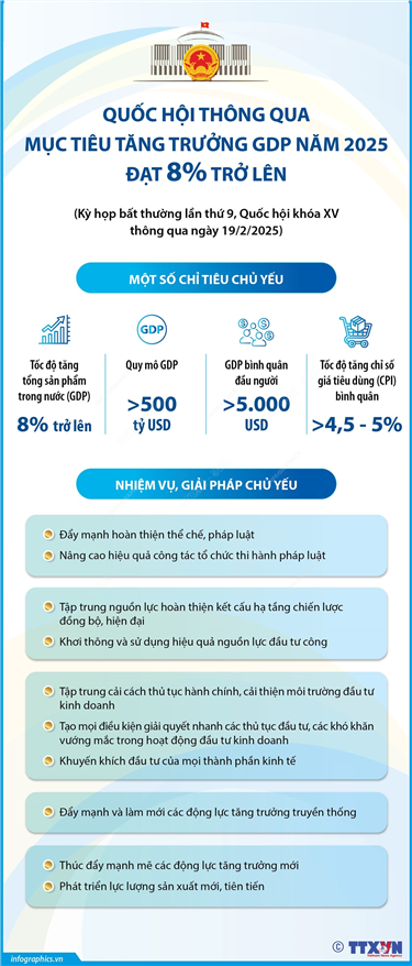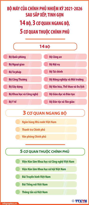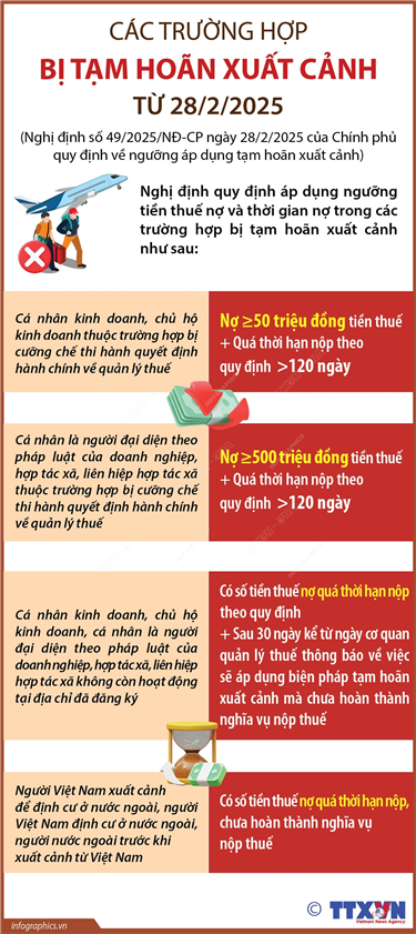 Tin cùng chuyên mục 35 thủ tục hành chính, dịch vụ công trực tuyến Bộ Công an phân cấp tại Công an cấp xã12/03/2025 15:08Bộ Công an ban hành Hướng dẫn số 08/HD-BCA-V03 ngày 17/2/2025 phân cấp thực hiện tiếp nhận, giải quyết thủ tục hành chính và dịch vụ công trực tuyến khi không tổ chức Công an cấp huyện. Theo Bộ Công an, đối với các thủ tục hành chính/dịch vụ công... Mở rộng diện hưởng chính sách nghỉ hưu trước tuổi12/03/2025 15:07Thay mặt Bộ Chính trị, Thường trực Ban Bí thư Trần Cẩm Tú vừa ký Thông báo kết luận số 75-TB/TW ngày 7/3/2025 của Bộ Chính trị về điều chỉnh phạm vi và đối tượng áp dụng chính sách, chế độ đối với cán bộ, công chức, viên chức, người lao động... Tiếp tục miễn lệ phí trước bạ lần đầu cho ô tô điện chạy pin12/03/2025 15:06Theo Nghị định 51/2025/NĐ-CP ngày 1/3/2025 sửa đổi, bổ sung một số điều của Nghị định số 10/2022/NĐ-CP ngày 15/1/2022 của Chính phủ quy định về lệ phía trước bạ, xe ô tô điện chạy pin tiếp tục được miễn thuế trước bạ lần đầu đến ngày 28/2/2027. Các trường hợp bị tạm hoãn xuất cảnh từ 28/2/202512/03/2025 15:05Chính phủ vừa ban hành Nghị định số 49/2025/NĐ-CP ngày 28/2/2025 quy định về ngưỡng áp dụng tạm hoãn xuất cảnh. Nghị định quy định: Cá nhân kinh doanh, chủ hộ kinh doanh bị tạm hoãn xuất cảnh trong trường hợp bị cưỡng chế thi hành quyết định hành chính về quản lý... Bộ máy của Chính phủ nhiệm kỳ 2021-2026 sau sắp xếp, tinh gọn19/02/2025 11:01Sau sắp xếp, tinh gọn, Chính phủ nhiệm kỳ 2021-2026 có 14 Bộ, 3 Cơ quan ngang Bộ và 5 cơ quan thuộc Chính phủ. Quốc hội thông qua mục tiêu tăng trưởng GDP năm 2025 đạt 8% trở lên19/02/2025 11:01Tại Kỳ họp bất thường lần thứ 9, Quốc hội khóa XV, sáng 19/2/2025, với 463/464 đại biểu tham gia biểu quyết tán thành (chiếm 96,86% tổng số đại biểu), Quốc hội đã biểu quyết thông qua Nghị quyết của Quốc hội bổ sung Kế hoạch phát triển kinh tế-xã hội năm 2025 với mục tiêu tăng trưởng...