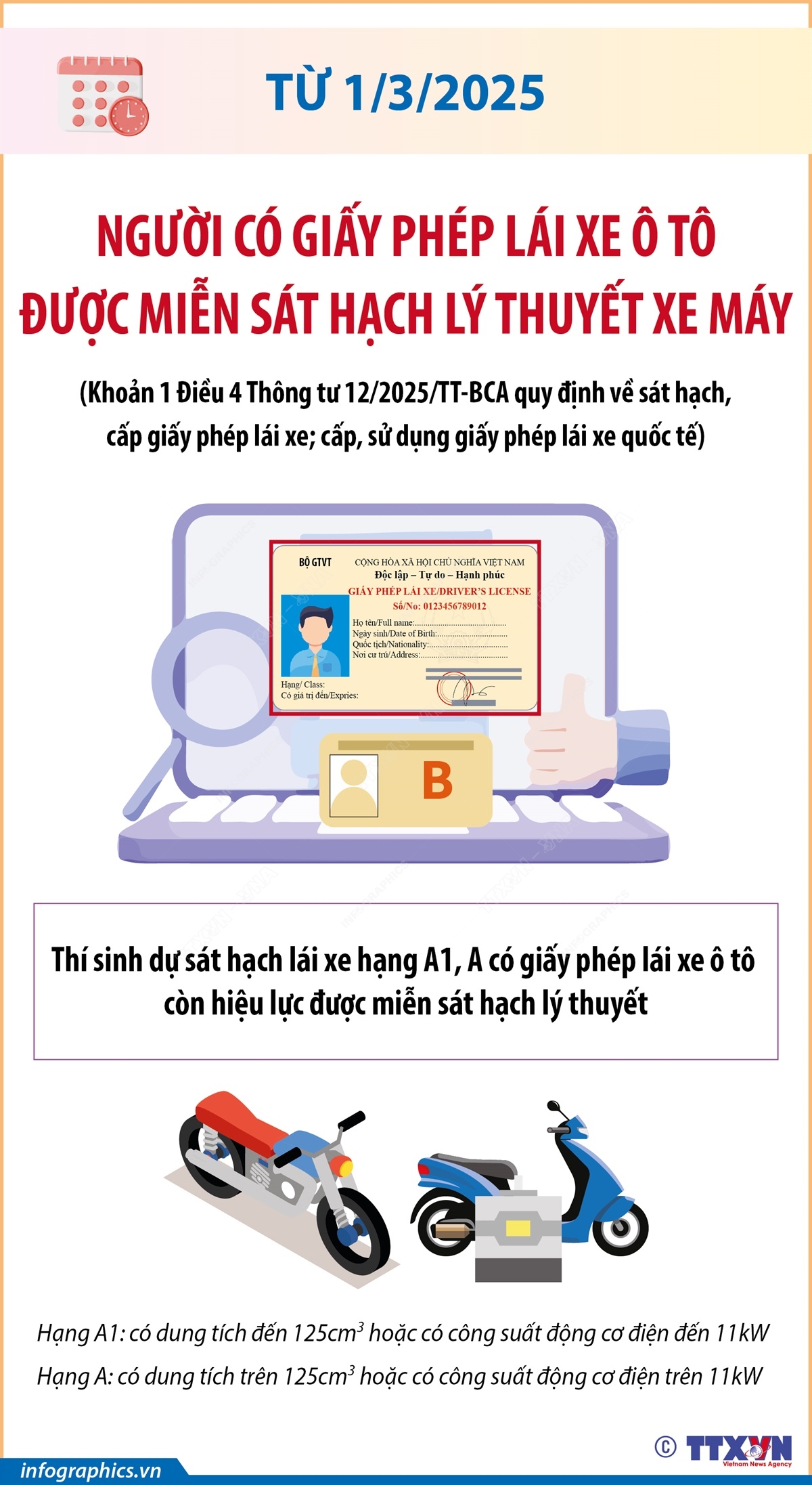 Phổ biến giáo dục Pháp luậtThông tin đồ họa Từ 1/3/2025: Người có giấy phép lái xe ô tô được miễn sát hạch lý thuyết xe máy Thứ tư, 12/03/2025 15:09 Theo Khoản 1 Điều 4 Thông tư 12/2025/TT-BCA quy định về sát hạch, cấp giấy phép lái xe; cấp, sử dụng giấy phép lái xe quốc tế, từ 1/3/2025, thí sinh dự sát hạch lái xe hạng A1, A có giấy phép lái xe ô tô còn hiệu lực được miễn sát hạch lý thuyết.