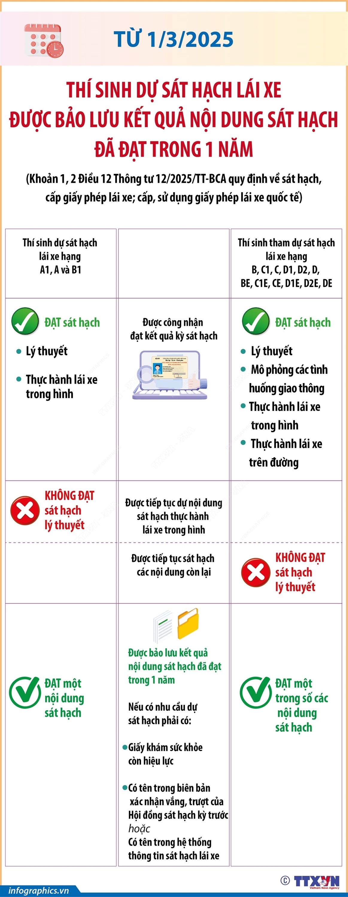 Phổ biến giáo dục Pháp luậtThông tin đồ họa Từ 1/3/2025: Thí sinh dự sát hạch lái xe được bảo lưu kết quả nội dung sát hạch đã đạt trong 1 năm Thứ tư, 12/03/2025 15:10 Theo Khoản 1,2 Điều 12 Thông tư 12/2025/TT-BCA quy định về sát hạch, cấp giấy phép lái xe; cấp, sử dụng giấy phép lái xe quốc tế, từ 1/3/2025, thí sinh tham dự sát hạch lái xe đạt một trong các nội dung sát hạch thì được công nhận kết quả nội dung sát hạch đó và được bảo lưu kết quả nội dung sát hạch đạt trong thời gian 1 năm kể từ ngày đạt kết quả sát hạch; nếu muốn dự sát hạch lại phải có giấy khám sức khỏe của người lái xe còn hiệu lực và phải có tên trong biên bản xác nhận vắng, trượt của Hội đồng sát hạch hoặc có tên trong hệ thống thông tin sát hạch lái xe.