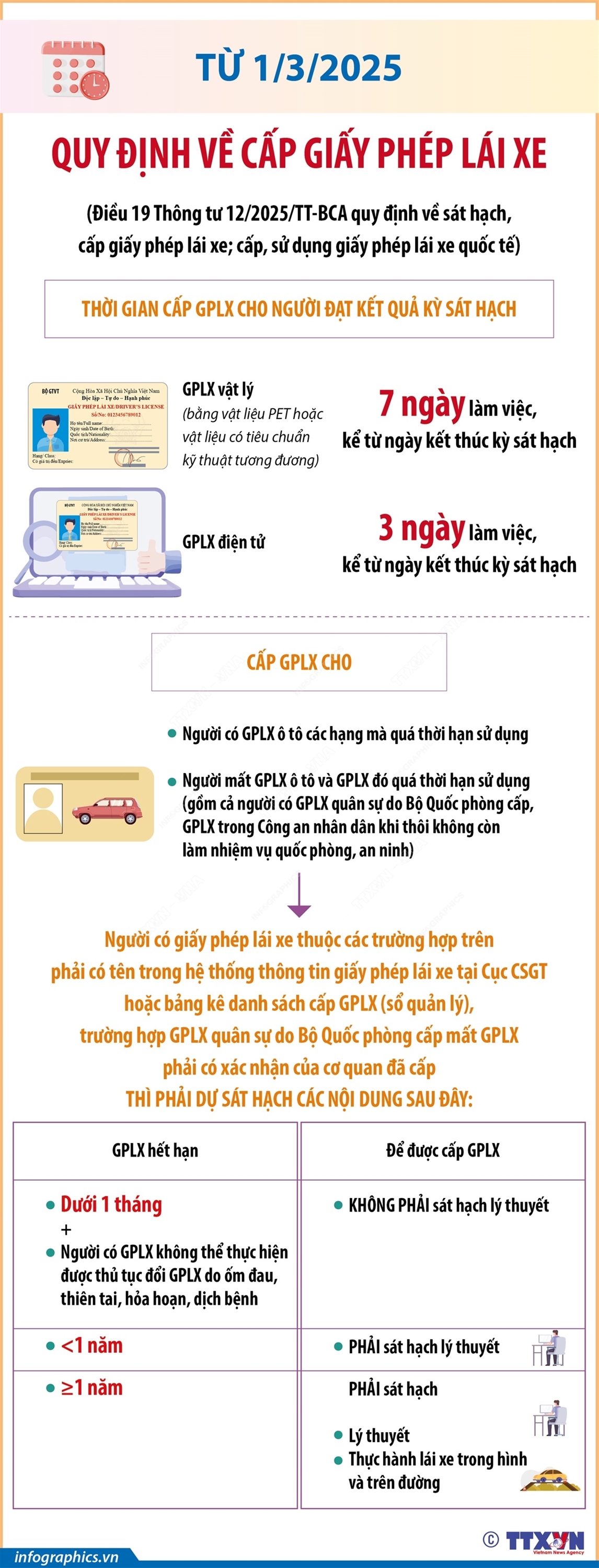 Phổ biến giáo dục Pháp luậtThông tin đồ họa Quy định về cấp giấy phép lái xe từ 1/3/2025 Thứ tư, 12/03/2025 15:12 Theo Điều 19 Thông tư 12/2025/TT-BCA của Bộ Công an, từ 1/3/2025, thời hạn cấp Giấy phép lái xe (GPLX) vật lý là 7 ngày làm việc; GPLX điện tử là 3 ngày, kể từ ngày kết thúc kỳ sát hạch. Trường hợp GPLX quá thời hạn sử dụng dưới 1 tháng kể từ ngày hết hạn mà người có GPLX không thể thực hiện được thủ tục đổi GPLX do ốm đau, thiên tai, hỏa hoạn, dịch bệnh thì người đó không phải sát hạch lý thuyết để cấp GPLX theo quy định. Trường hợp GPLX quá thời hạn sử dụng dưới 1 năm thì phải sát hạch lý thuyết; trên 1 năm thì phải sát hạch lý thuyết, thực hành lái xe trong hình và trên đường để cấp GPLX theo quy định.
