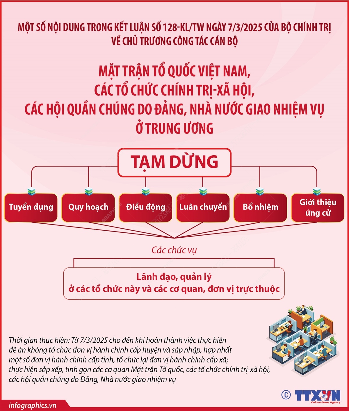Phổ biến giáo dục Pháp luậtThông tin đồ họa Kết luận số 128-KL/TW về công tác cán bộ tại MTTQ Việt Nam, các tổ chức chính trị-xã hội, các hội quần chúng ở Trung ương Thứ ba, 18/03/2025 14:17 Tại Kết luận số 128-KL/TW ngày 7/3/2025 về chủ trương công tác cán bộ, Bộ Chính trị thống nhất chủ trương tạm dừng việc tuyển dụng, quy hoạch, điều động, luân chuyển, bổ nhiệm, giới thiệu ứng cử các chức vụ lãnh đạo, quản lý tại Mặt trận Tổ quốc Việt Nam, các tổ chức chính trị-xã hội, các hội quần chúng do Đảng, Nhà nước giao nhiệm vụ ở Trung ương và các cơ quan, đơn vị trực thuộ