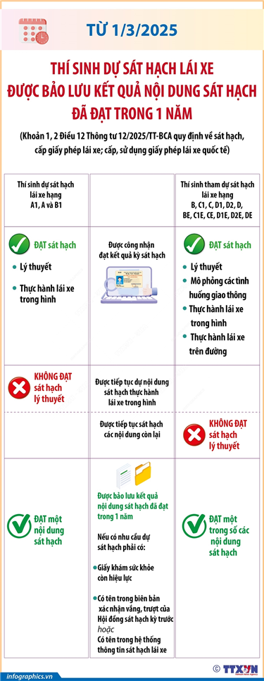 Tin cùng chuyên mục Kết luận số 128-KL/TW về công tác cán bộ tại MTTQ Việt Nam, các tổ chức chính trị-xã hội, các hội quần chúng ở Trung ương18/03/2025 14:17Tại Kết luận số 128-KL/TW ngày 7/3/2025 về chủ trương công tác cán bộ, Bộ Chính trị thống nhất chủ trương tạm dừng việc tuyển dụng, quy hoạch, điều động, luân chuyển, bổ nhiệm, giới thiệu ứng cử các chức vụ lãnh đạo, quản lý tại Mặt trận Tổ quốc Việt Nam, các tổ chức... Kết luận số 128-KL/TW về công tác cán bộ tại cấp huyện, cấp xã18/03/2025 14:16Tại Kết luận số 128-KL/TW ngày 7/3/2025 về chủ trương công tác cán bộ, Bộ Chính trị thống nhất chủ trương tạm dừng việc tuyển dụng, quy hoạch, điều động, luân chuyển, bổ nhiệm, giới thiệu ứng cử các chức vụ lãnh đạo, quản lý và kiện toàn, bổ sung cấp ủy, ban thường vụ cấp... Kết luận số 128-KL/TW về công tác cán bộ tại cấp tỉnh18/03/2025 14:16Tại Kết luận số 128-KL/TW ngày 7/3/2025 về chủ trương công tác cán bộ, Bộ Chính trị thống nhất chủ trương tạm dừng việc tuyển dụng, quy hoạch, điều động, luân chuyển, bổ nhiệm, cho chủ trương kiện toàn chức danh phó bí thư, chủ tịch HĐND, chủ tịch UBND, phó chủ tịch HĐND,... Kết luận số 128-KL/TW về các trường hợp đặc biệt, thật sự cần thiết phải kiện toàn, bổ sung18/03/2025 14:15Tại Kết luận số 128-KL/TW ngày 7/3/2025 về chủ trương công tác cán bộ, Bộ Chính trị thống nhất chủ trương về các trường hợp đặc biệt, thật sự cần thiết phải kiện toàn, bổ sung tại cấp tỉnh, cấp huyện, cấp xã. Quy định về cấp giấy phép lái xe từ 1/3/202512/03/2025 15:12Theo Điều 19 Thông tư 12/2025/TT-BCA của Bộ Công an, từ 1/3/2025, thời hạn cấp Giấy phép lái xe (GPLX) vật lý là 7 ngày làm việc; GPLX điện tử là 3 ngày, kể từ ngày kết thúc kỳ sát hạch. Trường hợp GPLX quá thời hạn sử dụng dưới 1 tháng kể từ... Từ 1/3/2025: Thí sinh dự sát hạch lái xe được bảo lưu kết quả nội dung sát hạch đã đạt trong 1 năm12/03/2025 15:10Theo Khoản 1,2 Điều 12 Thông tư 12/2025/TT-BCA quy định về sát hạch, cấp giấy phép lái xe; cấp, sử dụng giấy phép lái xe quốc tế, từ 1/3/2025, thí sinh tham dự sát hạch lái xe đạt một trong các nội dung sát hạch thì được công nhận kết quả nội dung sát...