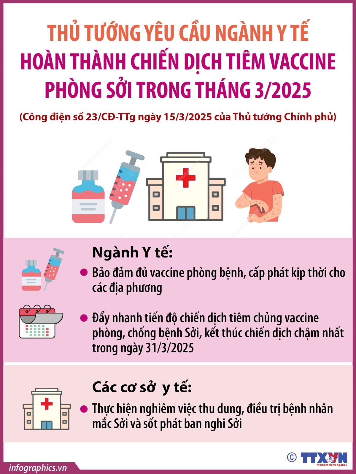 Phổ biến giáo dục Pháp luậtThông tin đồ họa Thủ tướng Chính phủ yêu cầu ngành y tế hoàn thành chiến dịch tiêm vaccine phòng Sởi trong tháng 3/2025 Thứ ba, 18/03/2025 14:18 Ngày 15/3/2025, Thủ tướng Chính phủ Phạm Minh Chính ký ban hành Công điện số 23/CĐ-TTg yêu cầu đẩy nhanh tiêm chủng vaccine phòng, chống bệnh Sởi. Công điện nêu: Dịch bệnh Sởi tiếp tục diễn biến phức tạp, một số địa phương vẫn ghi nhận số ca mắc cao. Để nhanh chóng kiểm soát dịch bệnh, không để lây lan, bùng phát trên diện rộng, Thủ tướng Chính phủ yêu cầu Bộ Y tế, các bộ, cơ quan, địa phương tiếp tục thực hiện nghiêm Công điện số 116/CĐ-TTg ngày 14/11/2024 của Thủ tướng Chính phủ về tăng cường công tác phòng, chống bệnh Sởi. Ngành y tế bảo đảm đủ vaccine phòng bệnh, cấp phát kịp thời cho các địa phương, đẩy nhanh tiến độ chiến dịch tiêm chủng vaccine phòng, chống bệnh Sởi, kết thúc chiến dịch chậm nhất trong ngày 31/3/2025. Các tỉnh, thành phố trực thuộc Trung ương có kế hoạch tổ chức chiến dịch tiêm vaccine phòng bệnh Sởi theo hướng dẫn của Bộ Y tế, không để bùng phát dịch Sởi trong thời gian tới. Người dân cần chủ động thực hiện các biện pháp phòng, chống bệnh Sởi và đưa trẻ đi tiêm chủng đầy đủ, đúng lịch theo hướng dẫn của ngành Y tế…