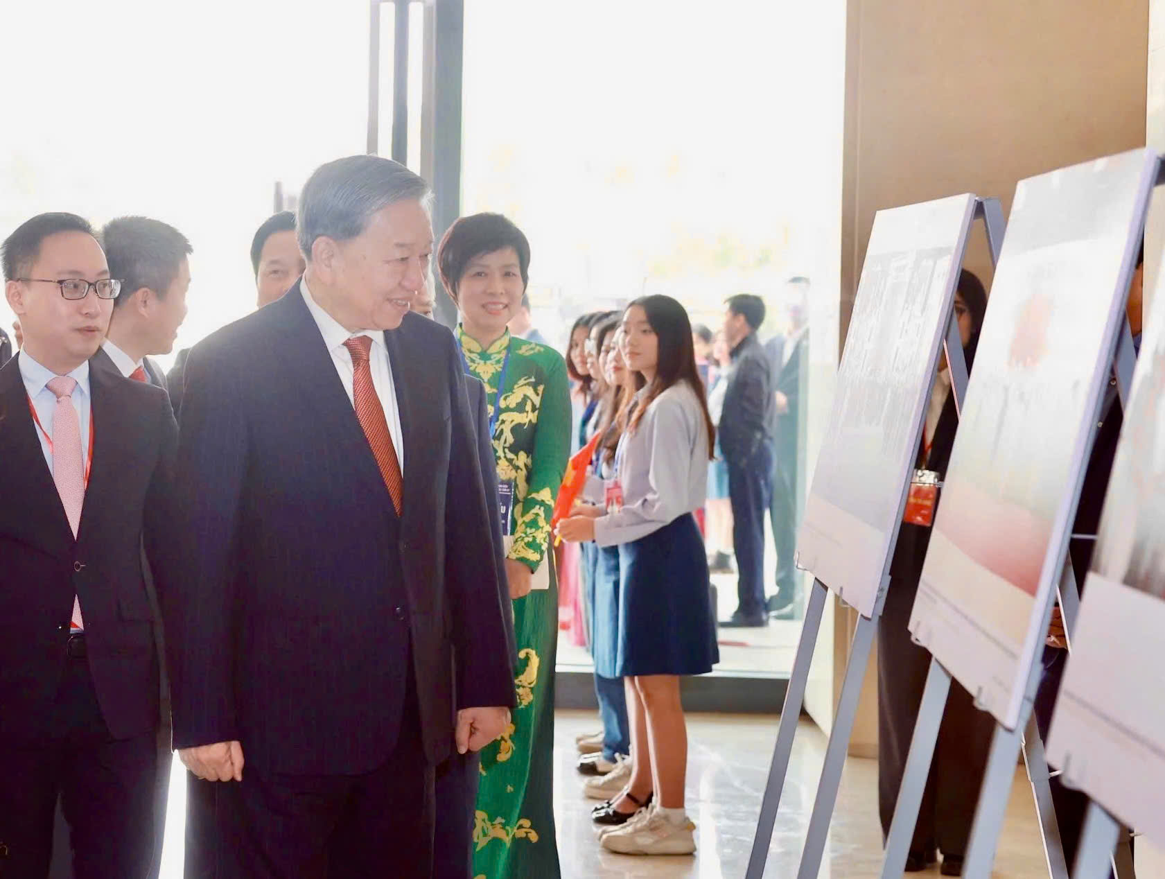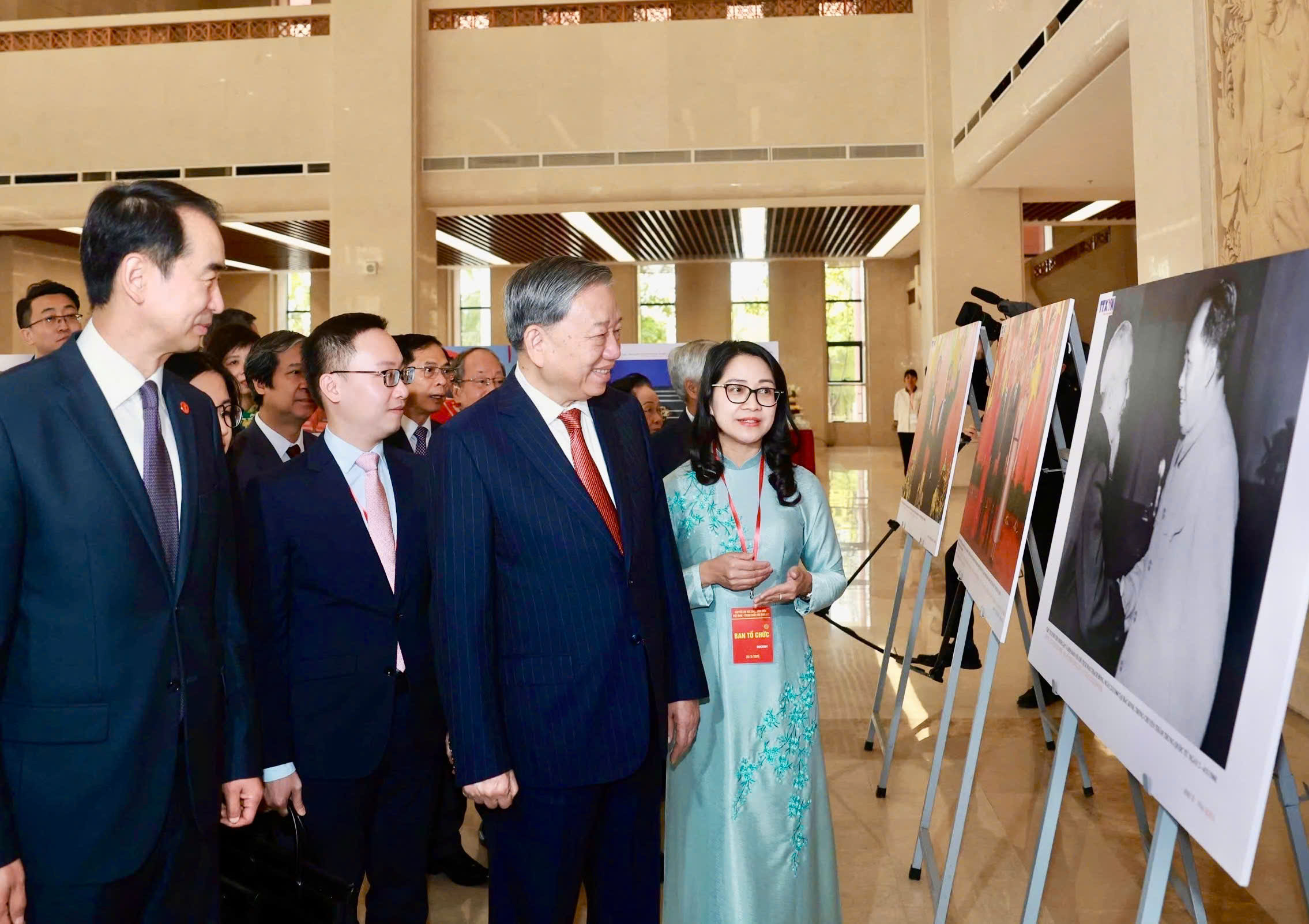 | Tổng Bí thư Tô Lâm cùng các đồng chí lãnh đạo, nguyên lãnh đạo Đảng, Nhà nước, Đại sứ Trung Quốc tại Việt Nam và Tổng giám đốc TTXVN Vũ Việt Trang tham quan trưng bày ảnh về thành tựu 75 năm quan hệ Việt Nam - Trung Quốc do TTXVN thực hiện, ngày 20/3 |
