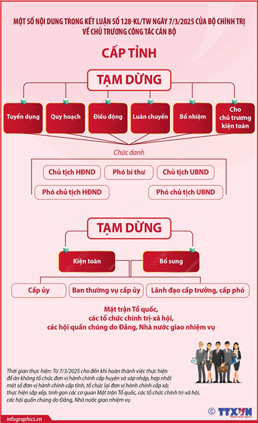 Tin cùng chuyên mục Người dân cần chủ động thực hiện các biện pháp phòng, chống bệnh Sởi18/03/2025 14:20Ngày 15/3/2025, Thủ tướng Chính phủ Phạm Minh Chính ký ban hành Công điện số 23/CĐ-TTg yêu cầu đẩy nhanh tiêm chủng vaccine phòng, chống bệnh Sởi. Công điện nêu: Dịch bệnh Sởi tiếp tục diễn biến phức tạp, một số địa phương vẫn ghi nhận số ca mắc cao. Để nhanh chóng... Thủ tướng Chính phủ yêu cầu các địa phương không bỏ sót các đối tượng tiêm vaccine, không để bùng phát dịch Sởi18/03/2025 14:19Ngày 15/3/2025, Thủ tướng Chính phủ Phạm Minh Chính ký ban hành Công điện số 23/CĐ-TTg yêu cầu đẩy nhanh tiêm chủng vaccine phòng, chống bệnh Sởi. Công điện nêu: Dịch bệnh Sởi tiếp tục diễn biến phức tạp, một số địa phương vẫn ghi nhận số ca mắc cao. Để nhanh chóng... Thủ tướng Chính phủ yêu cầu ngành y tế hoàn thành chiến dịch tiêm vaccine phòng Sởi trong tháng 3/202518/03/2025 14:18Ngày 15/3/2025, Thủ tướng Chính phủ Phạm Minh Chính ký ban hành Công điện số 23/CĐ-TTg yêu cầu đẩy nhanh tiêm chủng vaccine phòng, chống bệnh Sởi. Công điện nêu: Dịch bệnh Sởi tiếp tục diễn biến phức tạp, một số địa phương vẫn ghi nhận số ca mắc cao. Để nhanh chóng... Kết luận số 128-KL/TW về công tác cán bộ tại MTTQ Việt Nam, các tổ chức chính trị-xã hội, các hội quần chúng ở Trung ương18/03/2025 14:17Tại Kết luận số 128-KL/TW ngày 7/3/2025 về chủ trương công tác cán bộ, Bộ Chính trị thống nhất chủ trương tạm dừng việc tuyển dụng, quy hoạch, điều động, luân chuyển, bổ nhiệm, giới thiệu ứng cử các chức vụ lãnh đạo, quản lý tại Mặt trận Tổ quốc Việt Nam, các tổ chức... Kết luận số 128-KL/TW về công tác cán bộ tại cấp huyện, cấp xã18/03/2025 14:16Tại Kết luận số 128-KL/TW ngày 7/3/2025 về chủ trương công tác cán bộ, Bộ Chính trị thống nhất chủ trương tạm dừng việc tuyển dụng, quy hoạch, điều động, luân chuyển, bổ nhiệm, giới thiệu ứng cử các chức vụ lãnh đạo, quản lý và kiện toàn, bổ sung cấp ủy, ban thường vụ cấp... Kết luận số 128-KL/TW về công tác cán bộ tại cấp tỉnh18/03/2025 14:16Tại Kết luận số 128-KL/TW ngày 7/3/2025 về chủ trương công tác cán bộ, Bộ Chính trị thống nhất chủ trương tạm dừng việc tuyển dụng, quy hoạch, điều động, luân chuyển, bổ nhiệm, cho chủ trương kiện toàn chức danh phó bí thư, chủ tịch HĐND, chủ tịch UBND, phó chủ tịch HĐND,...