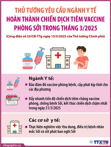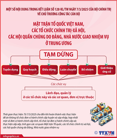 Tin cùng chuyên mục Sửa đổi, bổ sung Chính sách, chế độ trong thực hiện sắp xếp tổ chức bộ máy: Phạm vi điều chỉnh25/03/2025 11:43Chính phủ ban hành Nghị định 67/2025/NĐ-CP ngày 15/3/2025 sửa đổi, bổ sung một số điều của Nghị định số 178/2024/NĐ-CP ngày 31/12/2024 về chính sách, chế độ đối với cán bộ, công chức, viên chức, người lao động và lực lượng vũ trang trong thực hiện sắp xếp tổ chức bộ máy... Bộ Giáo dục và Đào tạo giữ nguyên lịch thi tốt nghiệp THPT 202525/03/2025 11:42Ngày 20/3/2025, Bộ Giáo dục và Đào tạo thông báo giữ nguyên lịch thi tốt nghiệp Trung học phổ thông 2025 như đã công bố trong kế hoạch năm học 2024-2025 (theo Quyết định 2045/QĐ-BGDĐT ngày 1/8/2024). Việc giữ nguyên lịch thi như đã công bố góp phần... Người dân cần chủ động thực hiện các biện pháp phòng, chống bệnh Sởi18/03/2025 14:20Ngày 15/3/2025, Thủ tướng Chính phủ Phạm Minh Chính ký ban hành Công điện số 23/CĐ-TTg yêu cầu đẩy nhanh tiêm chủng vaccine phòng, chống bệnh Sởi. Công điện nêu: Dịch bệnh Sởi tiếp tục diễn biến phức tạp, một số địa phương vẫn ghi nhận số ca mắc cao. Để nhanh chóng... Thủ tướng Chính phủ yêu cầu các địa phương không bỏ sót các đối tượng tiêm vaccine, không để bùng phát dịch Sởi18/03/2025 14:19Ngày 15/3/2025, Thủ tướng Chính phủ Phạm Minh Chính ký ban hành Công điện số 23/CĐ-TTg yêu cầu đẩy nhanh tiêm chủng vaccine phòng, chống bệnh Sởi. Công điện nêu: Dịch bệnh Sởi tiếp tục diễn biến phức tạp, một số địa phương vẫn ghi nhận số ca mắc cao. Để nhanh chóng... Thủ tướng Chính phủ yêu cầu ngành y tế hoàn thành chiến dịch tiêm vaccine phòng Sởi trong tháng 3/202518/03/2025 14:18Ngày 15/3/2025, Thủ tướng Chính phủ Phạm Minh Chính ký ban hành Công điện số 23/CĐ-TTg yêu cầu đẩy nhanh tiêm chủng vaccine phòng, chống bệnh Sởi. Công điện nêu: Dịch bệnh Sởi tiếp tục diễn biến phức tạp, một số địa phương vẫn ghi nhận số ca mắc cao. Để nhanh chóng... Kết luận số 128-KL/TW về công tác cán bộ tại MTTQ Việt Nam, các tổ chức chính trị-xã hội, các hội quần chúng ở Trung ương18/03/2025 14:17Tại Kết luận số 128-KL/TW ngày 7/3/2025 về chủ trương công tác cán bộ, Bộ Chính trị thống nhất chủ trương tạm dừng việc tuyển dụng, quy hoạch, điều động, luân chuyển, bổ nhiệm, giới thiệu ứng cử các chức vụ lãnh đạo, quản lý tại Mặt trận Tổ quốc Việt Nam, các tổ chức...