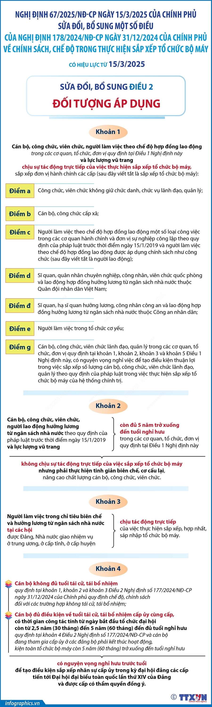 Phổ biến giáo dục Pháp luậtThông tin đồ họa Sửa đổi, bổ sung Chính sách, chế độ trong thực hiện sắp xếp tổ chức bộ máy: Đối tượng áp dụng Thứ ba, 25/03/2025 11:44 Chính phủ ban hành Nghị định 67/2025/NĐ-CP ngày 15/3/2025 sửa đổi, bổ sung một số điều của Nghị định số 178/2024/NĐ-CP ngày 31/12/2024 về chính sách, chế độ đối với cán bộ, công chức, viên chức, người lao động và lực lượng vũ trang trong thực hiện sắp xếp tổ chức bộ máy của hệ thống chính trị.