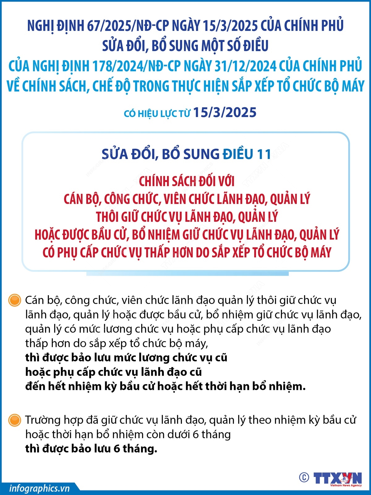 Phổ biến giáo dục Pháp luậtThông tin đồ họa Sửa đổi, bổ sung Chính sách đối với cán bộ, công chức, viên chức lãnh đạo, quản lý thôi giữ chức vụ lãnh đạo, quản lý hoặc được bầu cử, bổ nhiệm giữ chức vụ lãnh đạo, quản lý có phụ cấp chức vụ thấp hơn do sắp xếp tổ chức bộ máy Thứ tư, 26/03/2025 12:46 Chính phủ ban hành Nghị định 67/2025/NĐ-CP ngày 15/3/2025 sửa đổi, bổ sung một số điều của Nghị định số 178/2024/NĐ-CP ngày 31/12/2024 về chính sách, chế độ đối với cán bộ, công chức, viên chức, người lao động và lực lượng vũ trang trong thực hiện sắp xếp tổ chức bộ máy của hệ thống chính trị.