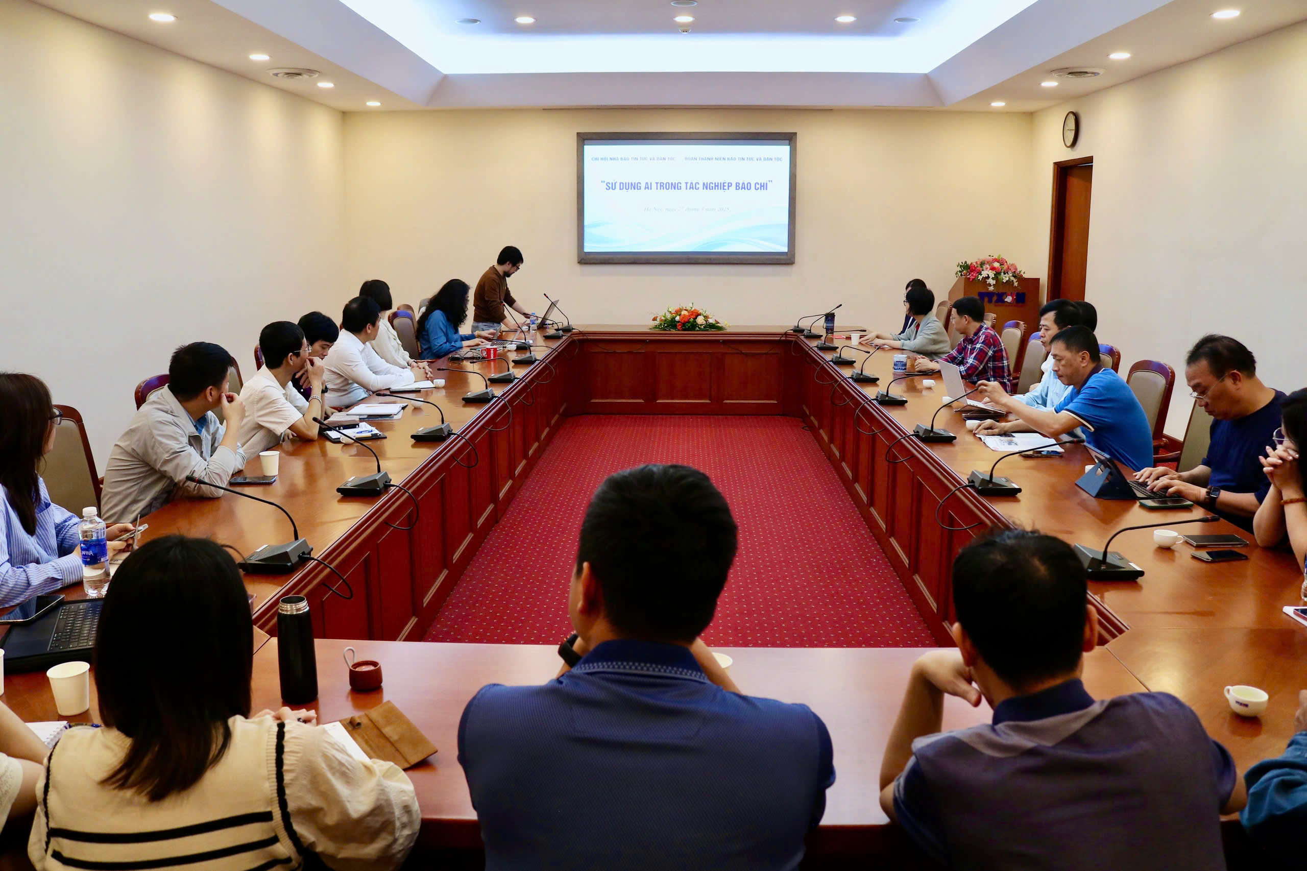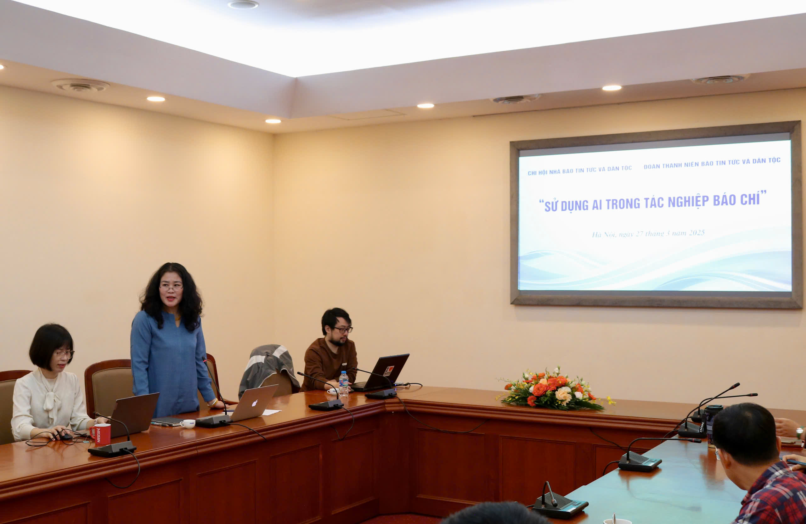Sự kiện và kỷ niệmTin trong ngành Nâng cao kỹ năng sử dụng AI trong tác nghiệp báo chí Thứ sáu, 28/03/2025 15:50 Ngày 27/3, Chi hội nhà báo và Chi đoàn báo Tin tức thuộc Thông tấn xã Việt Nam (TTXVN) đã phối hợp tổ chức buổi trao đổi nghiệp vụ với chủ đề “Sử dụng AI trong tác nghiệp báo chí”. Phó tổng biên tập báo Tin tức Phạm Thùy Hương phát biểu tại buổi trao đổi nghiệp vụ với chủ đề “Sử dụng AI trong tác nghiệp báo chí”, ngày 27/3 Tại buổi trao đổi, các phóng viên, biên tập viên được nghe diễn giả Nguyễn Phong Anh, giảng viên báo chí đa phương tiện trường Đại học Khoa học Xã hội và Nhân văn, Đại học Quốc gia Hà Nội giới thiệu và hướng dẫn cách sử dụng các công cụ AI như: Gemini, Suno, CapCut, Memobot… trong quá trình tác nghiệp. Đồng thời, được thực hành sử dụng các công cụ AI trong sản xuất podcast, video ngắn, e-magazine, lồng tiếng, chuyển chữ viết sang giọng nói… cùng các phương pháp đặt câu lệnh hiệu quả, cách phát hiện nội dung do AI tạo ra… Phó tổng biên tập báo Tin tức Phạm Thùy Hương cho biết, năm 2024, báo Tin tức thuộc top 10 cơ quan báo chí Trung ương đạt mức độ trưởng thành chuyển đổi số xuất sắc. Ban biên tập rất quan tâm phát triển các loại hình thông tin đa phương tiện để đáp ứng yêu cầu ngày càng cao của độc giả. Buổi trao đổi nghiệp vụ là hoạt động thiết thực, giúp mỗi cán bộ, phóng viên, biên tập viên có thêm kiến thức, kỹ năng sử dụng các công cụ AI nhằm hỗ trợ hiệu quả quá trình tác nghiệp, nâng cao chất lượng tác phẩm báo chí, đáp ứng nhu cầu của độc giả./. Diễn giả Nguyễn Phong Anh, giảng viên báo chí đa phương tiện trường Đại học Khoa học Xã hội và Nhân văn, Đại học Quốc gia Hà Nội giới thiệu các công cụ AI sử dụng trong quá trình tác nghiệp báo chí, ngày 27/3 TTXVN/Nội san Thông tấn