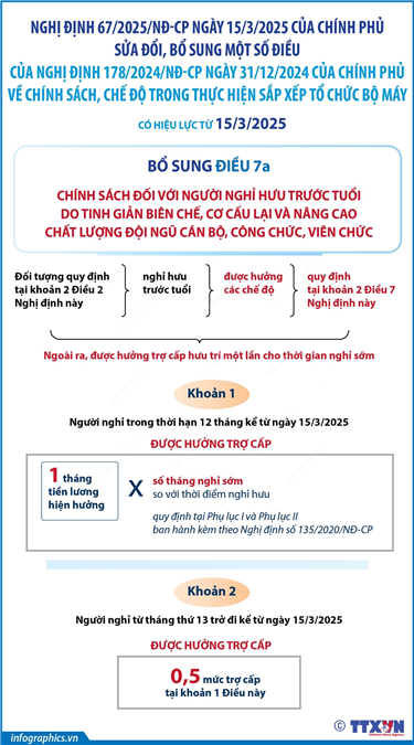 Tin cùng chuyên mục Sửa đổi, bổ sung Chính sách đối với cán bộ, công chức, viên chức lãnh đạo, quản lý thôi giữ chức vụ lãnh đạo, quản lý hoặc được bầu cử, bổ nhiệm giữ chức vụ lãnh đạo, quản lý có phụ cấp chức vụ thấp hơn do sắp xếp tổ chức bộ máy26/03/2025 12:46Chính phủ ban hành Nghị định 67/2025/NĐ-CP ngày 15/3/2025 sửa đổi, bổ sung một số điều của Nghị định số 178/2024/NĐ-CP ngày 31/12/2024 về chính sách, chế độ đối với cán bộ, công chức, viên chức, người lao động và lực lượng vũ trang trong thực hiện sắp xếp tổ chức bộ máy... Lịch thi tốt nghiệp THPT năm 2025 đối với các thí sinh dự thi đề thi của chương trình GDPT 200625/03/2025 12:48Kỳ thi tốt nghiệp THPT năm 2025 diễn ra trong hai ngày 26 và 27/6/2025, với hai lịch thi dành cho thí sinh học theo Chương trình Giáo dục phổ thông hiện hành 2018 và thí sinh học theo Chương trình Giáo dục phổ thông 2006. Lịch thi tốt nghiệp THPT năm 2025 đối với các thí sinh dự thi đề thi của chương trình GDPT hiện hành25/03/2025 12:47Kỳ thi tốt nghiệp THPT năm 2025 diễn ra trong hai ngày 26 và 27/6/2025, với hai lịch thi dành cho thí sinh học theo Chương trình Giáo dục phổ thông hiện hành 2018 và thí sinh học theo Chương trình Giáo dục phổ thông 2006. Trước 30/6/2025, Quốc hội xem xét thông qua việc sáp nhập các tỉnh25/03/2025 12:46Theo Công văn số 43-CV/BCĐ về Kế hoạch tiếp tục sắp xếp tổ chức bộ máy của hệ thống chính trị ngày 20/3/2025, Ban Chỉ đạo Trung ương về tổng kết việc thực hiện Nghị quyết số 18-NQ/TW yêu cầu Đảng ủy Quốc hội lãnh đạo, chỉ đạo: Việc thực hiện các quy trình và sửa đổi, bổ sung một số... Bổ sung Chính sách nghỉ hưu trước tuổi đối với cán bộ không đủ tuổi tái cử, tái bổ nhiệm hoặc đủ điều kiện về tuổi tái cử, tái bổ nhiệm25/03/2025 12:45Chính phủ ban hành Nghị định 67/2025/NĐ-CP ngày 15/3/2025 sửa đổi, bổ sung một số điều của Nghị định số 178/2024/NĐ-CP ngày 31/12/2024 về chính sách, chế độ đối với cán bộ, công chức, viên chức, người lao động và lực lượng vũ trang trong thực hiện sắp xếp tổ chức bộ máy... Bổ sung Chính sách đối với người nghỉ hưu trước tuổi do tinh giản biên chế, cơ cấu lại và nâng cao chất lượng đội ngũ cán bộ, công chức, viên chức25/03/2025 11:46Chính phủ ban hành Nghị định 67/2025/NĐ-CP ngày 15/3/2025 sửa đổi, bổ sung một số điều của Nghị định số 178/2024/NĐ-CP ngày 31/12/2024 về chính sách, chế độ đối với cán bộ, công chức, viên chức, người lao động và lực lượng vũ trang trong thực hiện sắp xếp tổ chức bộ máy...