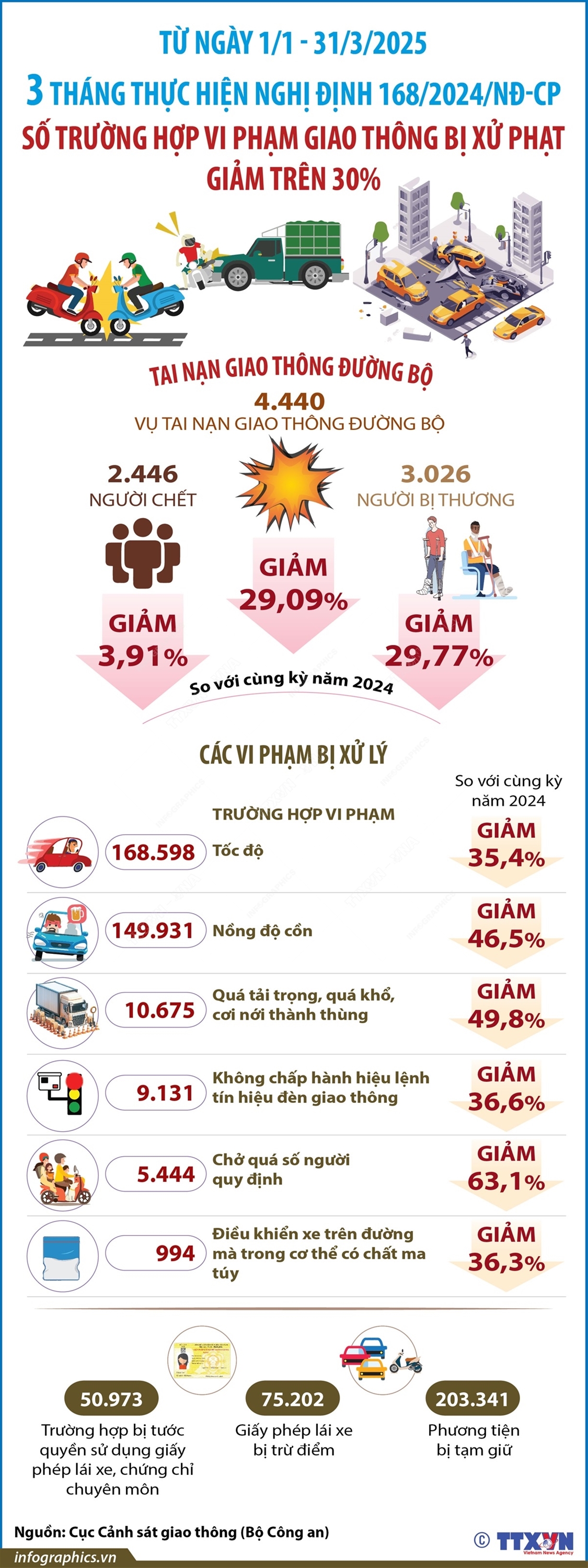 Phổ biến giáo dục Pháp luậtThông tin đồ họa Ba tháng thực hiện Nghị định 168/2024/NĐ-CP, số trường hợp vi phạm giao thông bị xử phạt giảm trên 30% Thứ tư, 02/04/2025 17:17 Hà Nội (TTXVN 1/4) Theo thông tin từ Cục Cảnh sát giao thông (Bộ Công an), sau 3 tháng (từ 1/1 - 31/3/2025) thực hiện Nghị định 168/2024/NĐ-CP quy định xử phạt vi phạm hành chính về trật tự, an toàn giao thông trong lĩnh vực giao thông đường bộ; trừ điểm, phục hồi điểm giấy phép lái xe, tình hình tai nạn giao thông có chuyển biến rõ rệt, giảm cả 3 tiêu chí so với cùng kỳ năm 2024. Trong 3 tháng qua, toàn quốc xảy ra 4.440 vụ tai nạn giao thông đường bộ, làm chết 2.446 người, bị thương 3.026 người; so với cùng kỳ năm 2024 giảm 1.821 vụ (29,09%), giảm 245 người chết (3,91%), giảm 1.864 người bị thương (29,77%). Các hành vi vi phạm có mức giảm cao là vi phạm nồng độ cồn, chở quá khổ, quá tải trọng, quá số người quy định… Phòng Tổng hợp - Kiểm tra - Pháp chế