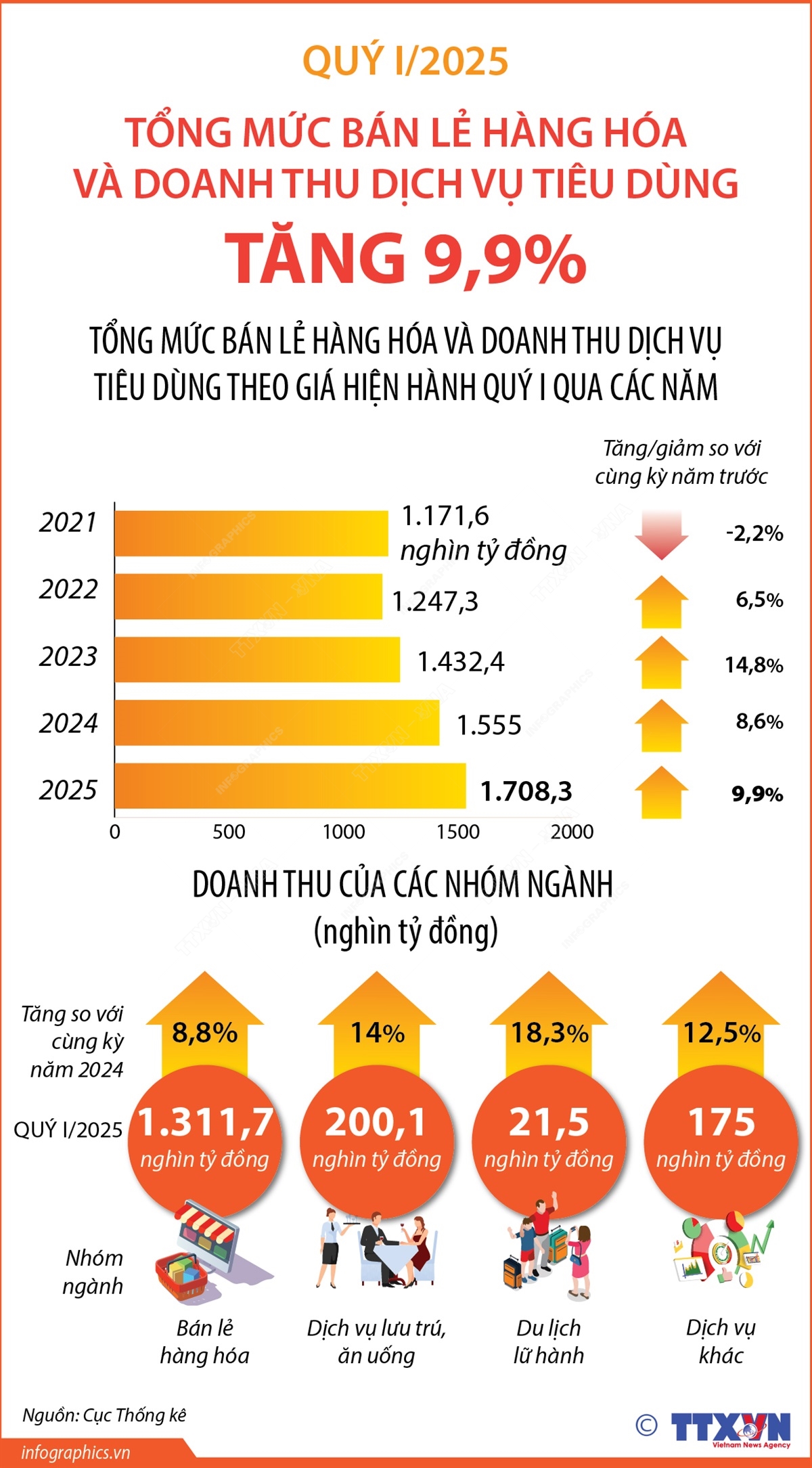 Phổ biến giáo dục Pháp luậtThông tin đồ họa Quý I/2025: Tổng mức bán lẻ hàng hóa và doanh thu dịch vụ tiêu dùng tăng 9,9% Thứ ba, 08/04/2025 14:40 Hà Nội (TTXVN 8/4) Quý I/2025, tổng mức bán lẻ hàng hóa và doanh thu dịch vụ tiêu dùng theo giá hiện hành ước đạt 1.708,3 nghìn tỷ đồng, tăng 9,9% so với cùng kỳ năm trước. Trong đó: doanh thu bán lẻ hàng hóa tăng 8,8%; doanh thu dịch vụ lưu trú, ăn uống tăng 14,0%; doanh thu du lịch lữ hành tăng 18,3% và doanh thu dịch vụ khác tăng 12,5%.