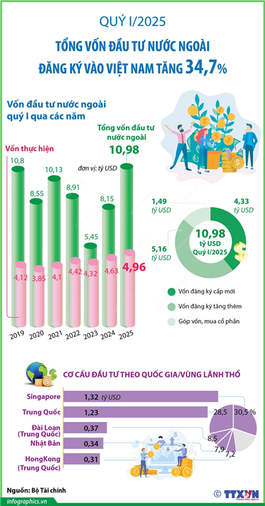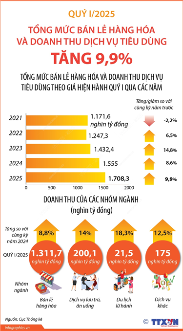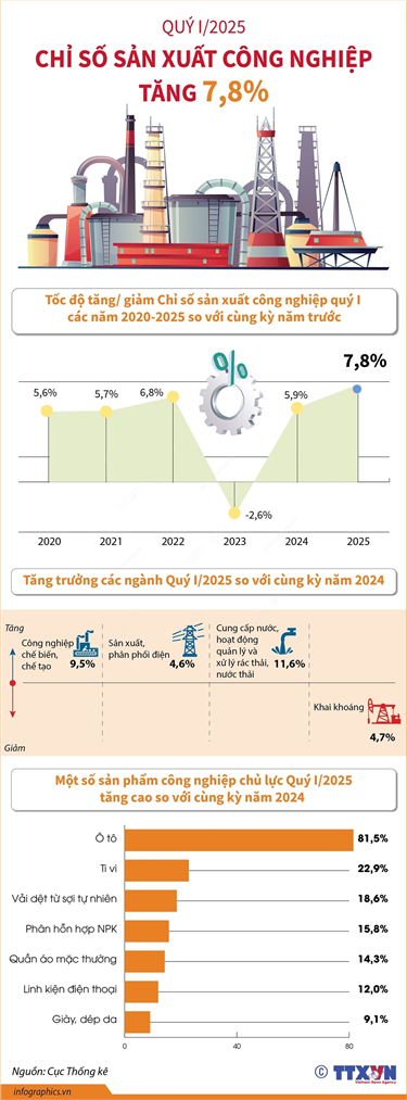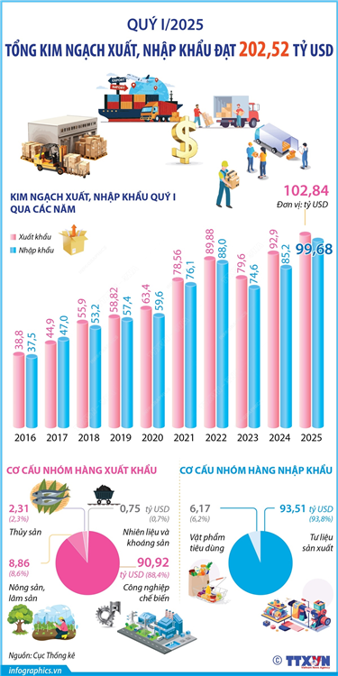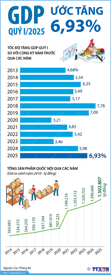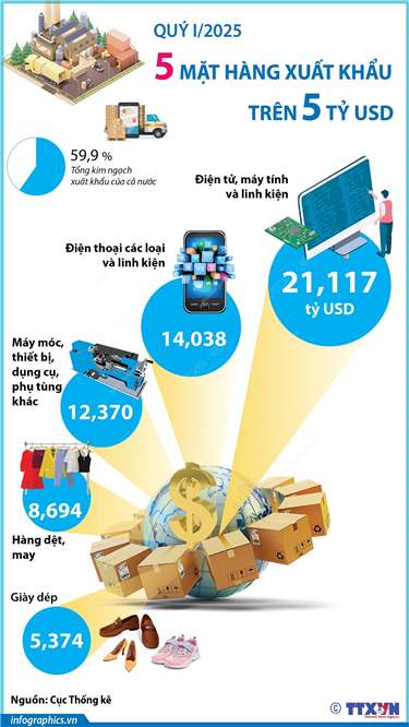 Tin cùng chuyên mục Quý I/2025: Chỉ số sản xuất công nghiệp tăng 7,8%08/04/2025 14:41Hà Nội (TTXVN 8/4) Quý I/2025, chỉ số sản xuất công nghiệp ước tính tăng 7,8% so với cùng kỳ năm trước, là mức tăng cao nhất của quý I kể từ năm 2020 đến nay. Trong đó công nghiệp chế biến, chế tạo tăng 9,5%; ngành sản xuất và phân phối điện tăng 4,6%; ngành... Quý I/2025: Tổng mức bán lẻ hàng hóa và doanh thu dịch vụ tiêu dùng tăng 9,9%08/04/2025 14:40Hà Nội (TTXVN 8/4) Quý I/2025, tổng mức bán lẻ hàng hóa và doanh thu dịch vụ tiêu dùng theo giá hiện hành ước đạt 1.708,3 nghìn tỷ đồng, tăng 9,9% so với cùng kỳ năm trước. Trong đó: doanh thu bán lẻ hàng hóa tăng 8,8%; doanh thu dịch... Quý I/2025: Tổng vốn đầu tư nước ngoài đăng ký vào Việt Nam tăng 34,7%08/04/2025 14:39 Quý I/2025, GDP ước tăng 6,93%08/04/2025 14:39Hà Nội (TTXVN 6/4) Tổng sản phẩm trong nước (GDP) quý I/2025 ước tính tăng 6,93% so với cùng kỳ năm trước, đạt mức tăng cao nhất so với quý I các năm trong giai đoạn 2020-2025. Quý I/2025, tổng kim ngạch xuất, nhập khẩu đạt 202,52 tỷ USD08/04/2025 14:37Hà Nội (TTXVN 6/4) Tính chung quý I/2025, tổng kim ngạch xuất, nhập khẩu hàng hóa đạt 202,52 tỷ USD, tăng 13,7% so với cùng kỳ năm trước, trong đó xuất khẩu tăng 10,6% và nhập khẩu tăng 17,0%. Cán cân thương mại hàng hóa xuất siêu 3,16 tỷ USD. Quý I/2025, 5 mặt hàng xuất khẩu trên 5 tỷ USD08/04/2025 09:55Hà Nội (TTXVN 8/4) Quý I/2025 có 5 mặt hàng xuất khẩu trên 5 tỷ USD, chiếm 59,9% tổng kim ngạch xuất khẩu của cả nước. Đó là các mặt hàng: Điện tử, máy tính và linh kiện; điện thoại các loại và linh kiện; máy móc, thiết bị, dụng cụ, phụ...