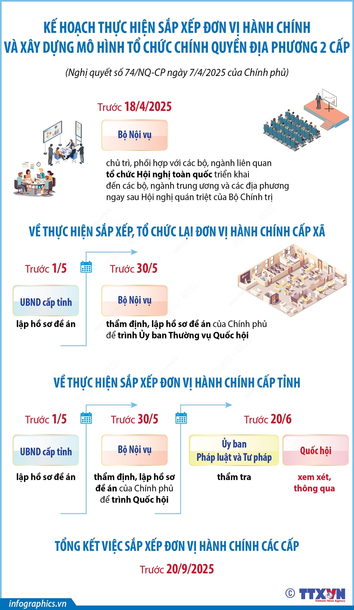 Phổ biến giáo dục Pháp luậtThông tin đồ họa Tổng kết việc sắp xếp đơn vị hành chính các cấp trước ngày 20/9/2025 Thứ tư, 09/04/2025 10:03 Hà Nội (TTXVN 8/4) Ngày 7/4/2025, Chính phủ đã ban hành Nghị quyết số 74/NQ-CP về Kế hoạch thực hiện sắp xếp đơn vị hành chính và xây dựng mô hình tổ chức chính quyền địa phương 2 cấp (Kế hoạch). Theo Kế hoạch, trước ngày 18/4/2025, Bộ Nội vụ chủ trì, phối hợp với các bộ, ngành liên quan tổ chức Hội nghị toàn quốc triển khai đến các bộ, ngành trung ương và các địa phương ngay sau Hội nghị quán triệt của Bộ Chính trị. Về thực hiện sắp xếp, tổ chức lại đơn vị hành chính cấp xã, UBND cấp tỉnh lập hồ sơ đề án trước ngày 1/5. Trước ngày 30/5, Bộ Nội vụ thẩm định, lập hồ sơ đề án của Chính phủ để trình Ủy ban Thường vụ Quốc hội. Về thực hiện sắp xếp đơn vị hành chính cấp tỉnh, trước ngày 1/5, UBND cấp tỉnh lập hồ sơ đề án. Trước ngày 30/5, Bộ Nội vụ lập hồ sơ đề án của Chính phủ để trình Quốc hội. Ủy ban Pháp luật và Tư pháp thẩm tra, Quốc hội xem xét, thông qua trước ngày 20/6/2025. Tổng kết việc sắp xếp đơn vị hành chính các cấp trước ngày 20/9/2025.