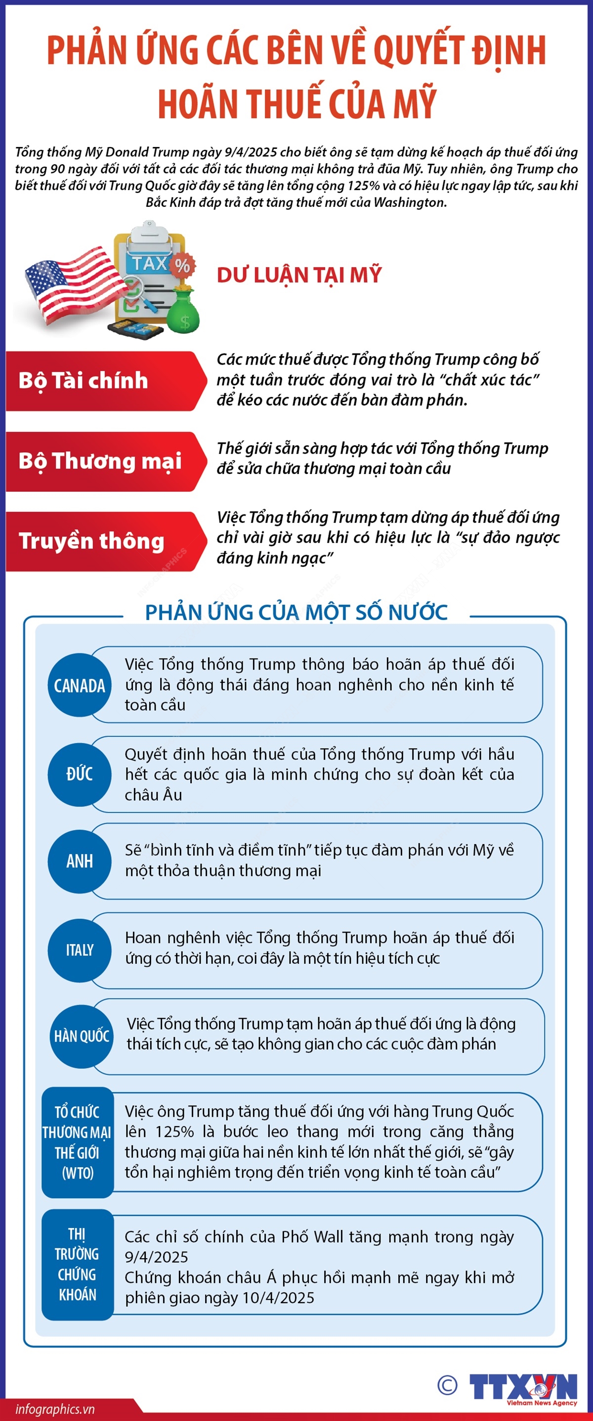 Phổ biến giáo dục Pháp luậtThông tin đồ họa Phản ứng các bên về quyết định hoãn thuế của Mỹ Thứ năm, 10/04/2025 10:48 Hà Nội (TTXVN 10/4) Tổng thống Mỹ Donald Trump ngày 9/4/2025 cho biết ông sẽ tạm dừng kế hoạch áp thuế đối ứng trong 90 ngày đối với tất cả các đối tác thương mại không trả đũa Mỹ. Tuy nhiên, ông Trump cho biết thuế đối với Trung Quốc giờ đây sẽ tăng lên tổng cộng 125% và có hiệu lực ngay lập tức, sau khi Bắc Kinh đáp trả đợt tăng thuế mới của Washington.