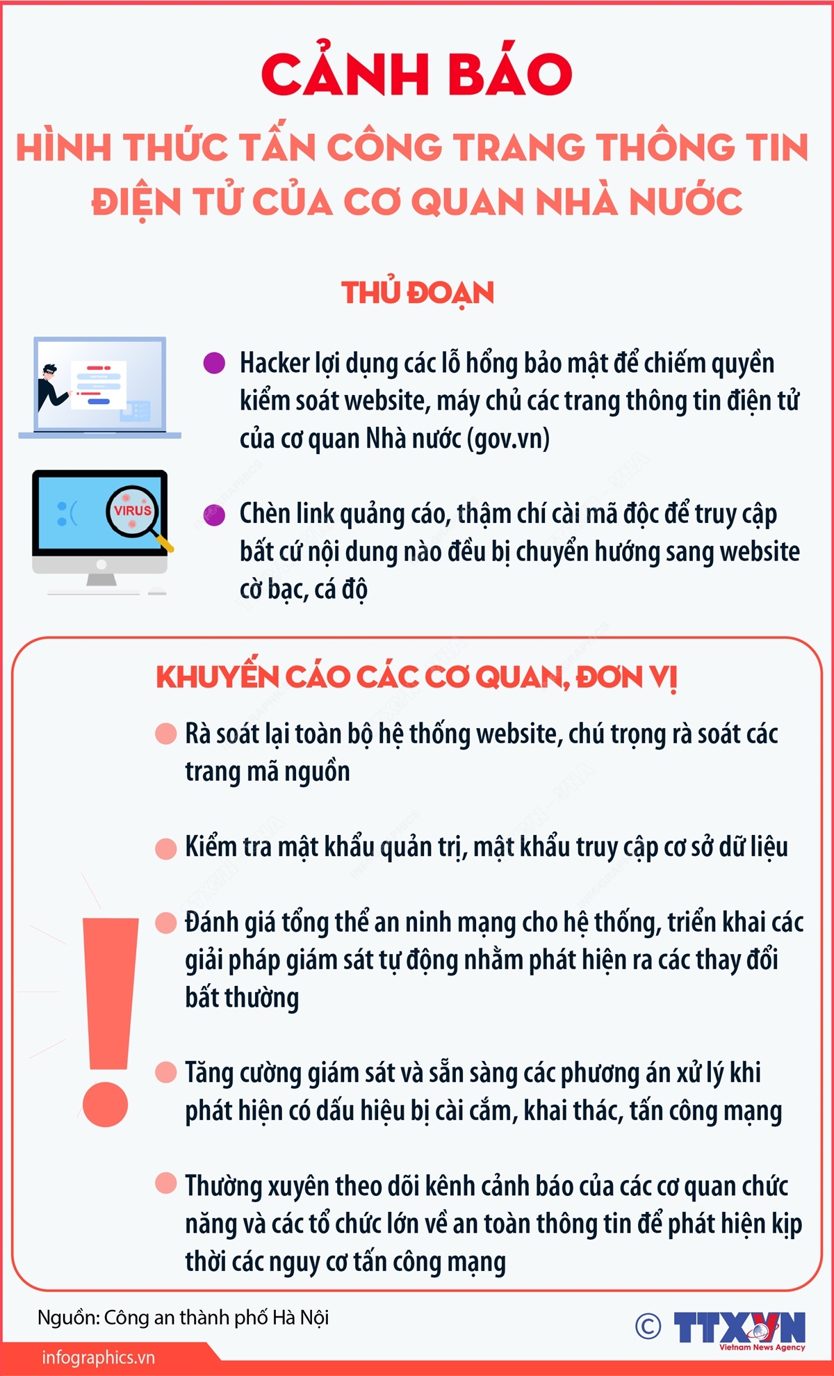 Phổ biến giáo dục Pháp luậtThông tin đồ họa Cảnh báo hình thức tấn công trang thông tin điện tử của cơ quan Nhà nước Thứ sáu, 11/04/2025 11:05 Hà Nội (TTXVN 11/4) Liên quan đến công tác phòng chống tội phạm trên không gian mạng, thời gian qua, Phòng An ninh mạng và phòng, chống tội phạm sử dụng công nghệ cao, Công an thành phố Hà Nội phát hiện nhiều trang thông tin điện tử của cơ quan Nhà nước (gov.vn) bị lợi dụng để cài cắm, đăng tải, chuyển hướng hoặc liên kết với nội dung quảng cáo không phù hợp như game bài, cờ bạc…