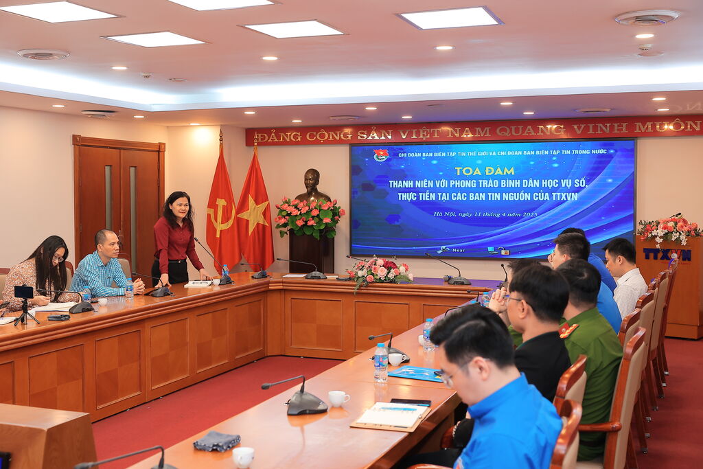 | Phó tổng giám đốc TTXVN Nguyễn Thị Sự và các đại biểu tại tọa đàm "Thanh niên với phong trào Bình dân học vụ số - thực tiễn tại các ban tin nguồn của TTXVN”, ngày 11/3 |
