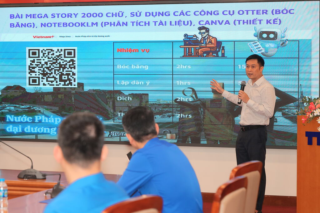 | Nhà báo Nguyễn Hoàng Nhật chia sẻ những ứng dụng công nghệ mới trong lĩnh vực báo chí tại tọa đàm "Thanh niên với phong trào Bình dân học vụ số - thực tiễn tại các ban tin nguồn của TTXVN”, ngày 11/3 |