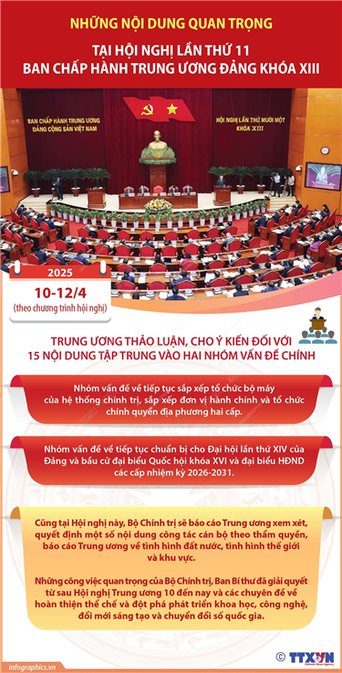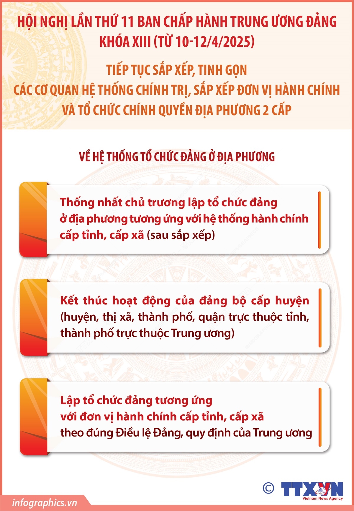 Phổ biến giáo dục Pháp luậtThông tin đồ họa Kết thúc hoạt động của đảng bộ cấp huyện (huyện, thị xã, thành phố, quận trực thuộc tỉnh, thành phố trực thuộc Trung ương) Thứ hai, 14/04/2025 11:10 Hà Nội (TTXVN 13/4) Tại Hội nghị lần thứ 11, Ban Chấp hành Trung ương thống nhất chủ trương lập tổ chức đảng ở địa phương tương ứng với hệ thống hành chính cấp tỉnh, cấp xã (sau sắp xếp). Kết thúc hoạt động của đảng bộ cấp huyện (huyện, thị xã, thành phố, quận trực thuộc tỉnh, thành phố trực thuộc Trung ương). Lập tổ chức đảng tương ứng với đơn vị hành chính cấp tỉnh, cấp xã theo đúng Điều lệ Đảng, quy định của Trung ương.