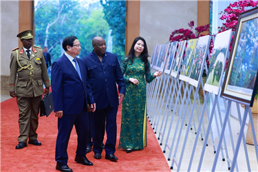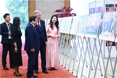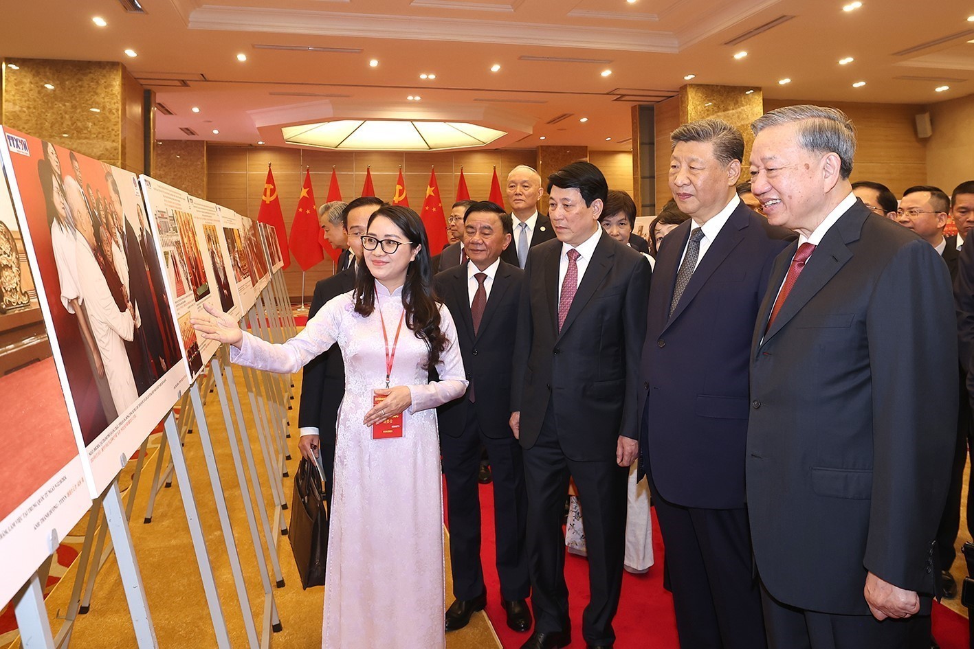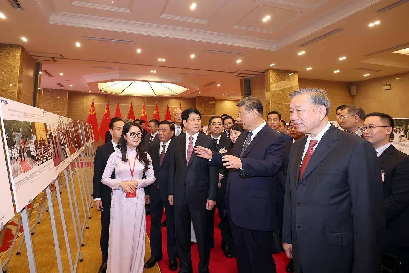 Sự kiện và kỷ niệmTin trong ngành Trưng bày ảnh 75 năm thiết lập quan hệ ngoại giao Việt Nam - Trung Quốc Thứ ba, 15/04/2025 09:26 Nhận lời mời của Tổng Bí thư Ban Chấp hành Trung ương Đảng Cộng sản Việt Nam Tô Lâm và Chủ tịch nước Cộng hòa xã hội chủ nghĩa Việt Nam Lương Cường, Tổng Bí thư Ban Chấp hành Trung ương Đảng Cộng sản Trung Quốc, Chủ tịch nước Cộng hòa Nhân dân Trung Hoa Tập Cận Bình đến Thủ đô Hà Nội, bắt đầu chuyến thăm cấp Nhà nước tới Việt Nam trong hai ngày 14-15/4. Phó trưởng ban Thư ký biên tập và Quan hệ đối ngoại TTXVN Nguyễn Ngọc Anh giới thiệu với Tổng Bí thư Tô Lâm, Chủ tịch nước Lương Cường cùng Tổng Bí thư, Chủ tịch nước Trung Quốc Tập Cận Bình những bức ảnh tiêu biểu về quan hệ hợp tác giữa hai nước, ngày 15/4 Trong khuôn khổ chuyến thăm và làm việc, sáng 15/4, tại Trung tâm Hội nghị quốc tế (Hà Nội), Tổng Bí thư Tô Lâm, Chủ tịch nước Lương Cường cùng Tổng Bí thư, Chủ tịch nước Trung Quốc Tập Cận Bình tham quan trưng bày ảnh “75 năm thiết lập quan hệ ngoại giao Việt Nam - Trung Quốc” do Thông tấn xã Việt Nam (TTXVN), Liên hiệp các tổ chức hữu nghị Việt Nam và hãng thông tấn Trung Quốc Tân Hoa xã phối hợp thực hiện./. Tổng Bí thư Tô Lâm, Chủ tịch nước Lương Cường cùng Tổng Bí thư, Chủ tịch nước Trung Quốc Tập Cận Bình xem những bức ảnh tiêu biểu về quan hệ hợp tác giữa hai nước, ngày 15/4 TTXVN/Nội san Thông tấn