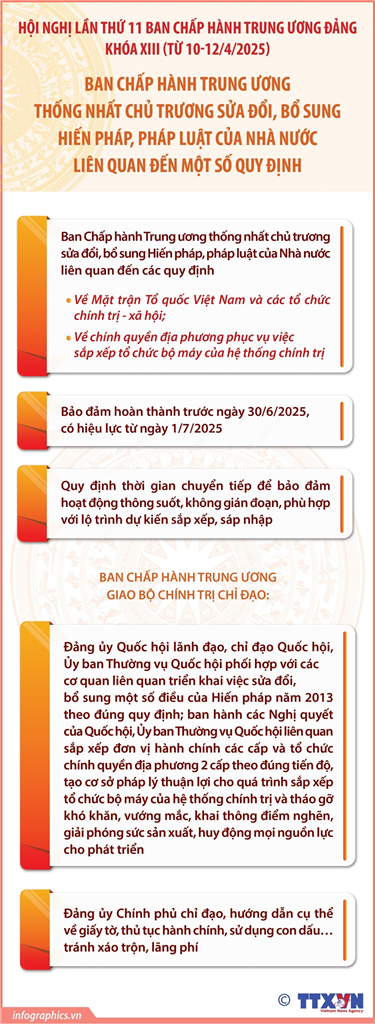 Tin cùng chuyên mục Hà Nội dự kiến còn 126 phường, xã sau sắp xếp: Dự kiến tên gọi, diện tích, dân số 47 phường21/04/2025 09:46Hà Nội (TTXVN 20/4) Ngày 19/4/2025, UBND thành phố Hà Nội có văn bản gửi UBND các quận, huyện, thị xã về phương án sắp xếp đơn vị hành chính cấp xã của thành phố để thực hiện lấy ý kiến nhân dân và tổ chức kỳ họp HĐND các cấp.... 7 văn bản thỏa thuận hợp tác trong lĩnh vực đường sắt và đường bộ giữa Việt Nam và Trung Quốc17/04/2025 09:35Hà Nội (TTXVN 16/4) Chiều 14/4/2025, tại trụ sở Trung ương Đảng, sau hội đàm cấp cao, Tổng Bí thư Tô Lâm và Tổng Bí thư, Chủ tịch nước Trung Quốc Tập Cận Bình đã cùng xem và nghe giới thiệu về 45 văn bản thỏa thuận hợp tác trên nhiều lĩnh vực được ký... Diện tích và dân số của 23 đơn vị hành chính cấp tỉnh sau sáp nhập16/04/2025 09:34Hà Nội (TTXVN 15/4) Phó Thủ tướng Thường trực Nguyễn Hòa Bình vừa ký Quyết định số 759/QĐ-TTg ngày 14/4/2025 phê duyệt Đề án sắp xếp, tổ chức lại đơn vị hành chính (ĐVHC) các cấp và xây dựng mô hình tổ chức chính quyền địa phương 2 cấp... Hà Nội: Khung giá cho thuê nhà ở xã hội từ 14/4/202514/04/2025 11:22Hà Nội (TTXVN 14/4) Theo Quyết định số 27/2025/QĐ-UBND của UBND TP Hà Nội, từ 14/4/2025, mức giá cho thuê nhà ở xã hội (được đầu tư xây dựng không bằng vốn đầu tư công, nguồn tài chính công đoàn) trên địa bàn thành phố thấp nhất là... Quan hệ Đối tác hợp tác chiến lược toàn diện Việt Nam-Trung Quốc14/04/2025 11:22Hà Nội (TTXVN 10/4) Nhận lời mời của Tổng Bí thư Ban Chấp hành Trung ương Đảng Cộng sản Việt Nam Tô Lâm, Chủ tịch nước Cộng hòa xã hội chủ nghĩa Việt Nam Lương Cường, Tổng Bí thư Ban Chấp hành Trung ương Đảng Cộng sản Trung Quốc, Chủ tịch nước Cộng hòa nhân dân Trung... Ban Chấp hành Trung ương thống nhất chủ trương sửa đổi, bổ sung Hiến pháp, pháp luật của Nhà nước liên quan đến một số quy định14/04/2025 11:20Hà Nội (TTXVN 13/4) Tại hội nghị lần thứ 11, Ban Chấp hành Trung ương khóa XIII thống nhất chủ trương sửa đổi, bổ sung Hiến pháp, pháp luật của Nhà nước liên quan đến các quy định về Mặt trận Tổ quốc Việt Nam và các tổ chức chính trị - xã hội; các quy định...