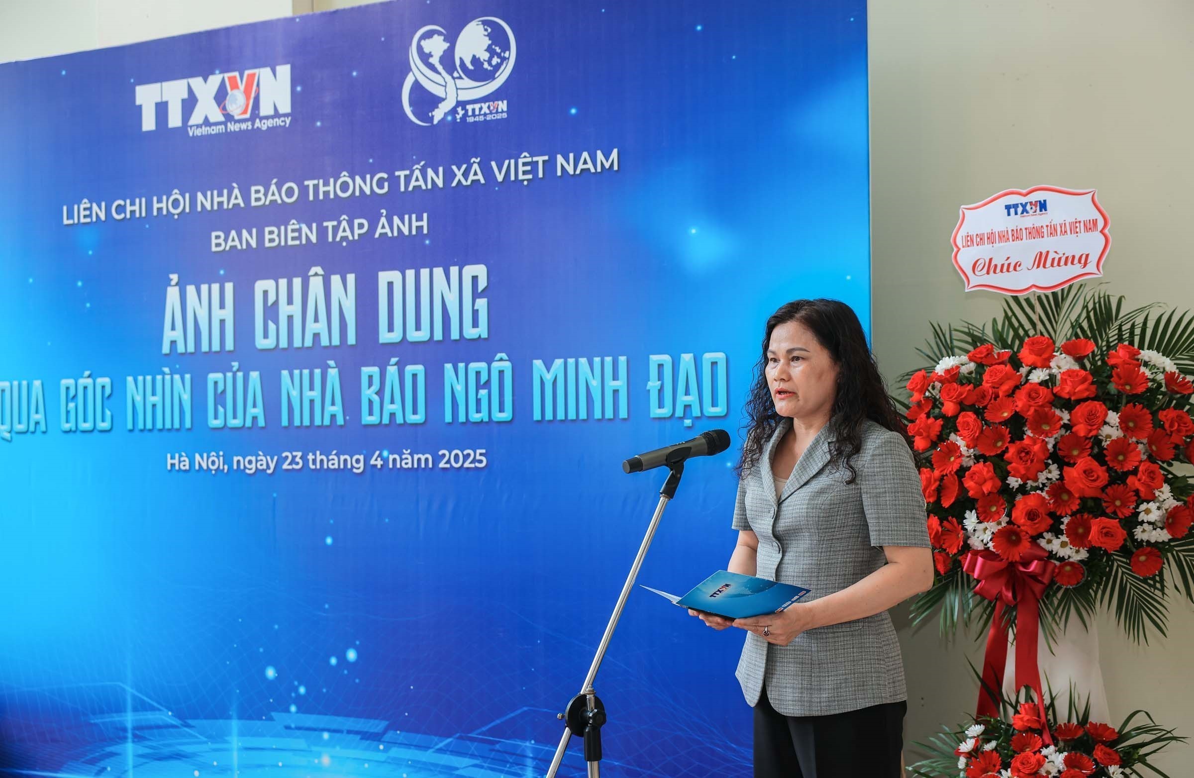 Sự kiện và kỷ niệmTin trong ngành Nhà báo Ngô Minh Đạo với chân dung đồng nghiệp Thứ tư, 23/04/2025 10:24 Chiều 23/4, tại Trung tâm Thông tấn quốc gia (Hà Nội), Liên chi hội nhà báo Thông tấn xã Việt Nam (TTXVN) phối hợp với Ban biên tập Ảnh tổ chức Trưng bày ảnh “Ảnh chân dung - góc nhìn của nhà báo Ngô Minh Đạo”. Phó tổng giám đốc, Phó chủ tịch Liên chi hội nhà báo TTXVN Nguyễn Thị Sự phát biểu tại trưng bày ảnh, ngày 23/4 Phát biểu tại trưng bày, Phó tổng giám đốc Nguyễn Thị Sự cho biết: Với hơn 40 năm gắn bó với nghề, trải qua nhiều địa bàn ác liệt, nhà báo, nghệ sĩ nhiếp ảnh Ngô Minh Đạo là nhân chứng ghi lại nhiều sự kiện lịch sử quan trọng. Ông cùng với các thế hệ phóng viên chiến trường của TTXVN đã có những đóng góp quan trọng trong việc xây dựng truyền thống vẻ vang của TTXVN cũng như đóng góp vào sự nghiệp báo chí nước nhà. Qua những bức ảnh tại triển lãm, công chúng có thể cảm nhận được tình yêu nghề cùng góc nhìn nhân hậu của nhà báo Ngô Minh Đạo đối với bạn bè, đồng nghiệp cũng như niềm đam mê sáng tác của ông. Nhà báo, nghệ sĩ nhiếp ảnh Ngô Minh Đạo giới thiệu những bức ảnh chân dung các nhà báo - phóng viên chiến trường của TTXVN tại trưng bày ảnh, ngày 23/4 Nhà báo Ngô Minh Đạo chia sẻ: “Hôm nay, tôi rất hạnh phúc và vinh dự khi được trưng bày những tấm ảnh chụp chân dung các đồng nghiệp của mình ở khắp mọi miền của Tổ quốc, từ chiến trường B-C-K. Các anh, các chị không chỉ đối mặt với kẻ thù, mưa bom bão đạn, mà còn phải vượt lên những suy tư, lo lắng của mỗi cá nhân trong lằn ranh sống - chết để hoàn thành sứ mệnh của người chép sử trong lửa đạn”. Nhân dịp này, nhà báo Ngô Minh Đạo đã trao 5 cuốn sách của ông tặng TTXVN./. Nhà báo Ngô Minh Đạo (bên trái) trao tặng TTXVN 5 cuốn sách ảnh của mình tại trưng bày ảnh, ngày 23/4 Nội san Thông tấn/TTXVN