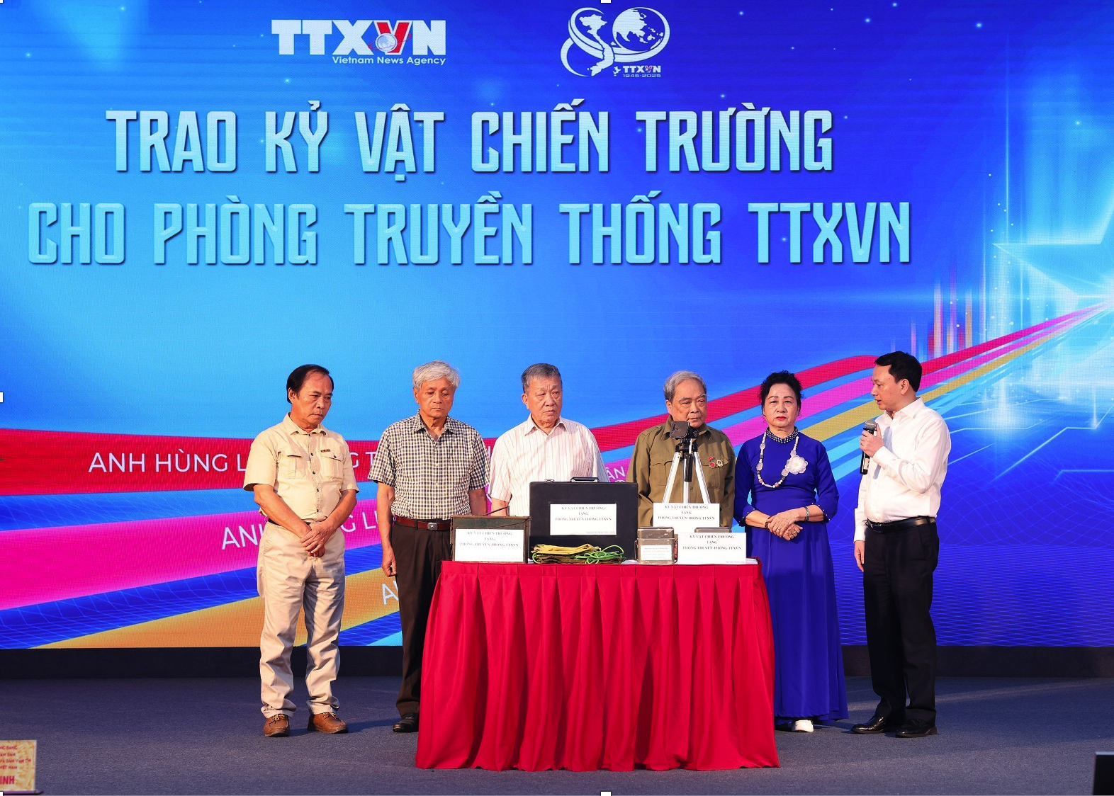 Cụ thể: ông Nguyễn Lâm Đông, thân nhân nhà báo Võ Thế Ái, trao tặng các quyết định công tác, huân chương, bằng khen của nhà báo lão thành Võ Thế Ái, nguyên Phó trưởng ban biên tập tin Trong nước. Ông Đào Trọng Vĩnh, lái xe chiến trường trao tặng ăng-gô, tăng dù ông từng sử dụng tại chiến trường miền Nam từ năm 1973-1975. Ông Nguyễn Hà Lộc trao tặng chân máy ảnh của nhà báo Nhật Bản Takano Isao, một trong những nhà báo quốc tế có mặt trong chiến tranh biên giới phía Bắc năm 1979 và bị trúng đạn, tử thương khi đang tác nghiệp tại Lạng Sơn. Bà Thân Thị Viết và ông Đỗ Văn Hảo, khóa GP10, trao tặng một số hiện vật như: ănggô, võng dù, hòm đạn đại liên, chứng minh thư nhân dân mà các ông, bà sử dụng trong thời gian ở chiến trường miền Nam từ năm 1973-1975.